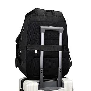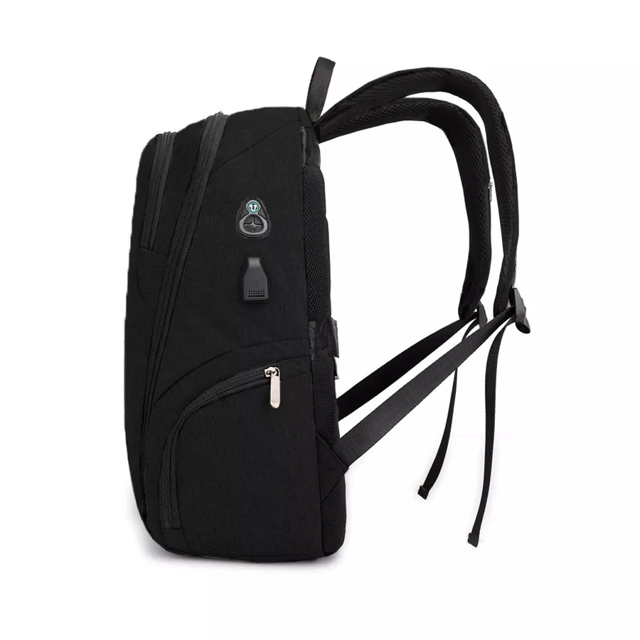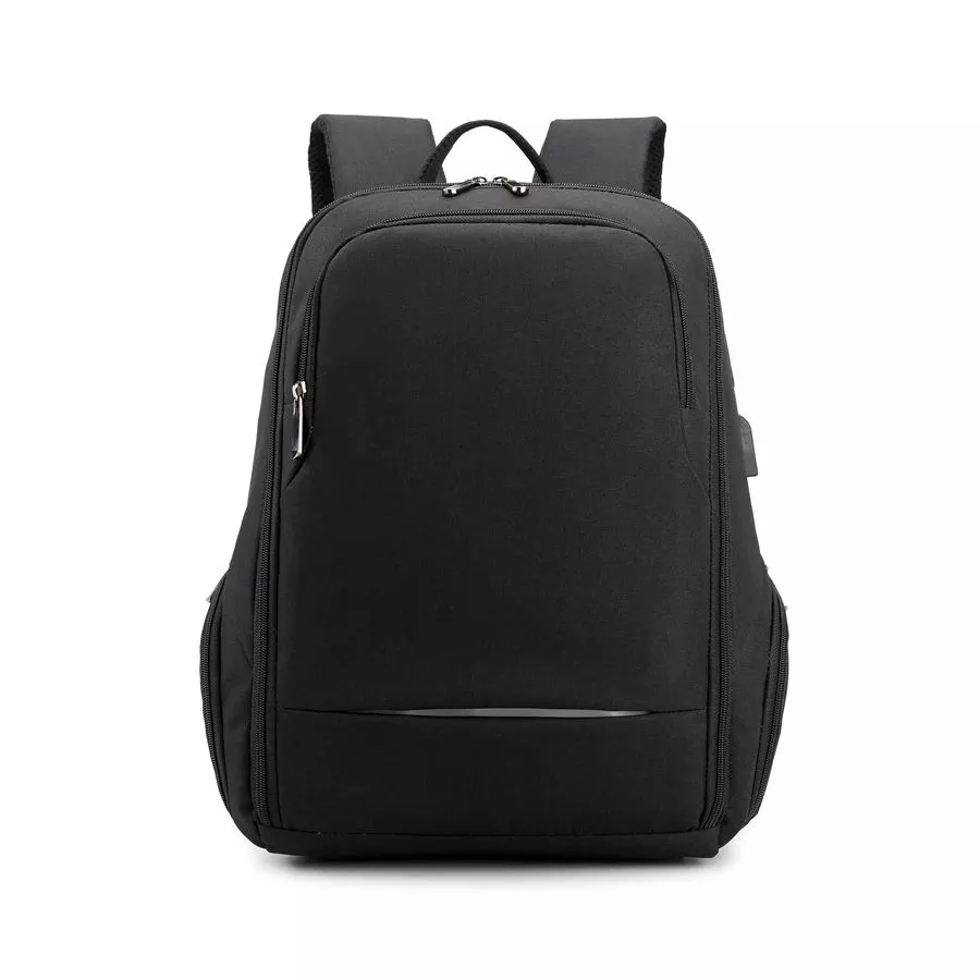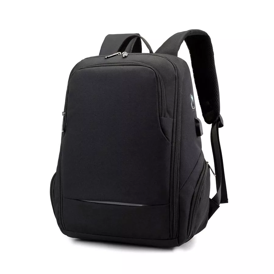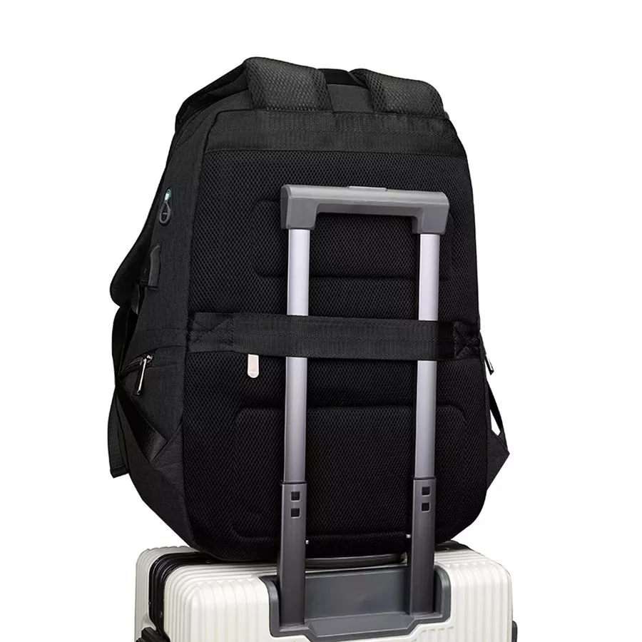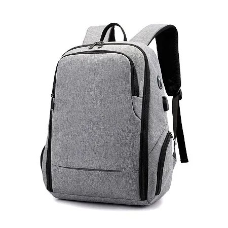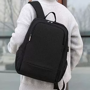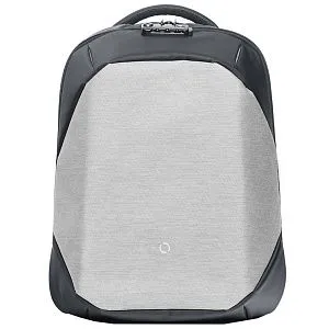 Сочетание прочных материалов и функциональности. Одно переднее отделение для мелочей. 2 боковых отделения на молнии, вместительное основное отделение имеет карман для ноутбука, 2 кармана для мелочей и 2 кармана для письменных принадлежностей. Снаружи есть USB-разъем с проводом внутри для подключения внешнего аккумулятора, а также отверстие для наушников. Ручка, спинка и лямки рюкзака с системой вентиляции, со стороны спины есть лямка для размещения рюкзака на ручке чемодана. На левой лямке есть карман на замке для пропуска/ проездного. На спинке рюкзака расположен большой скрытый карман.