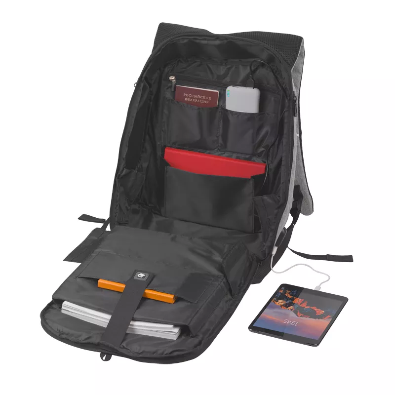 С внешней боковой стороны рюкзака расположен USB разъем для подзарядки вашего устройства (внутри рюкзака расположен кабель для соединения с power bank) и два боковых кармана на молнии.
