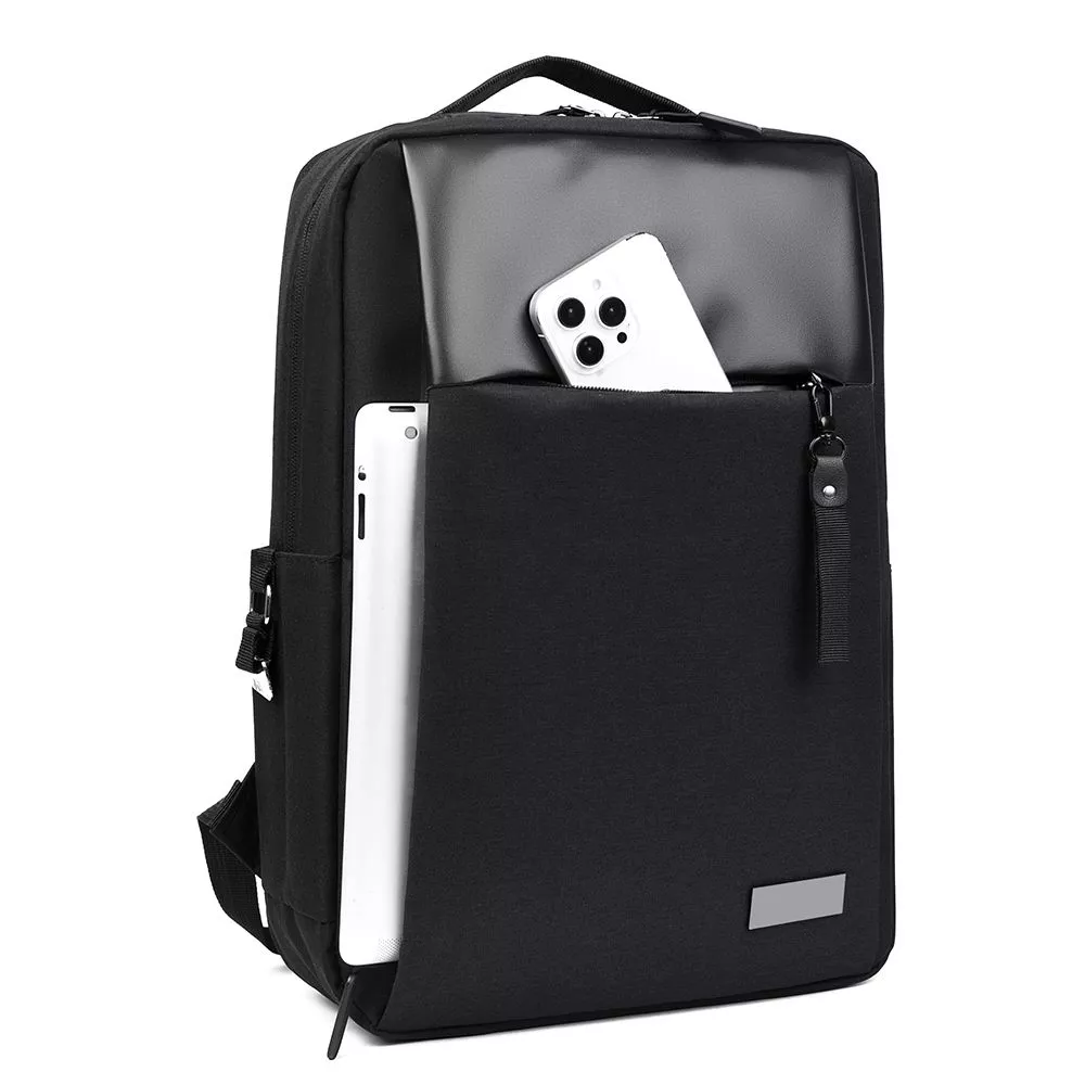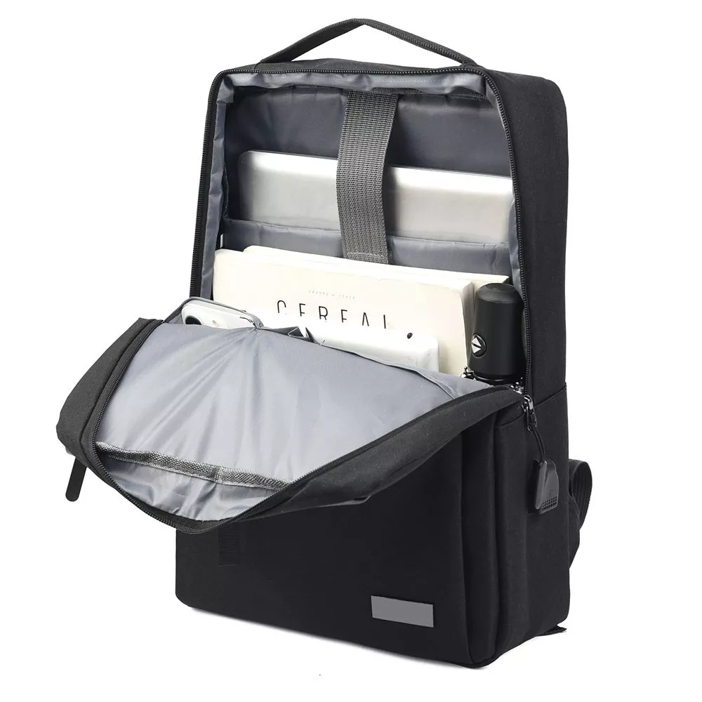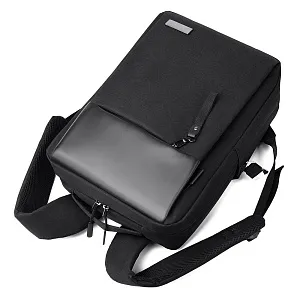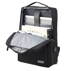 Практичная модель, удобная для использования в повседневной жизни. На лицевой части рюкзака есть 1 горизонтальный и 1 вертикальный карманы на молнии. Так же, с правой стороны рюкзака имеется USB-разъем с проводом внутри для подключения внешнего аккумулятора, с левой - открытый карман. Основное отделение имеет внутренний карман на липучке для ноутбука размером 14 дюймов, 1 карман для телефона или каких-то других мелочей.
