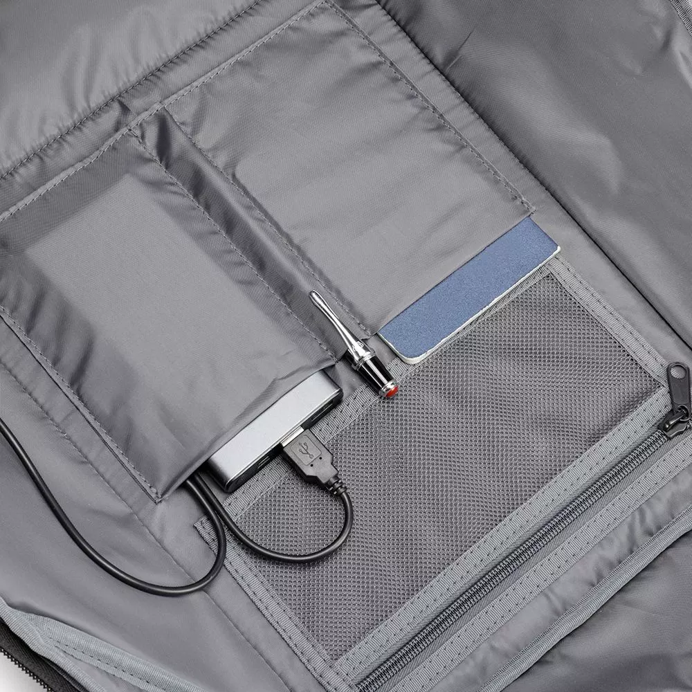 Внутри рюкзака уплотненные карманы для ноутбука размером до 15,6 дюймов, открытые карманы для аксессуаров, а также карман-сетка на молнии для арома-саше или других мелочей.