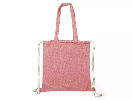 Рюкзак-мешок из переработанного хлопка плотностью 140 г/м² с меланжевой отделкой, ручками длиной 70 см в тон и шнурками натурального цвета.