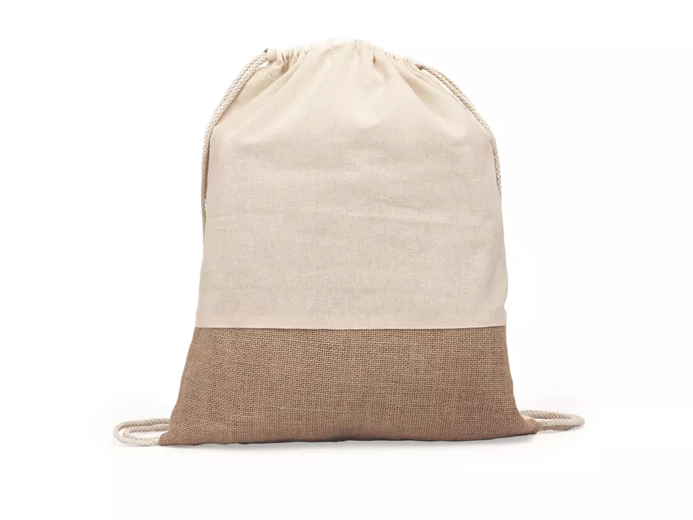Рюкзак-мешок Eco line из хлопка и джута плотностью 120 г/м². Натуральный цвет. Спереди рюкзак имеет джутовую ленту на нижней части.