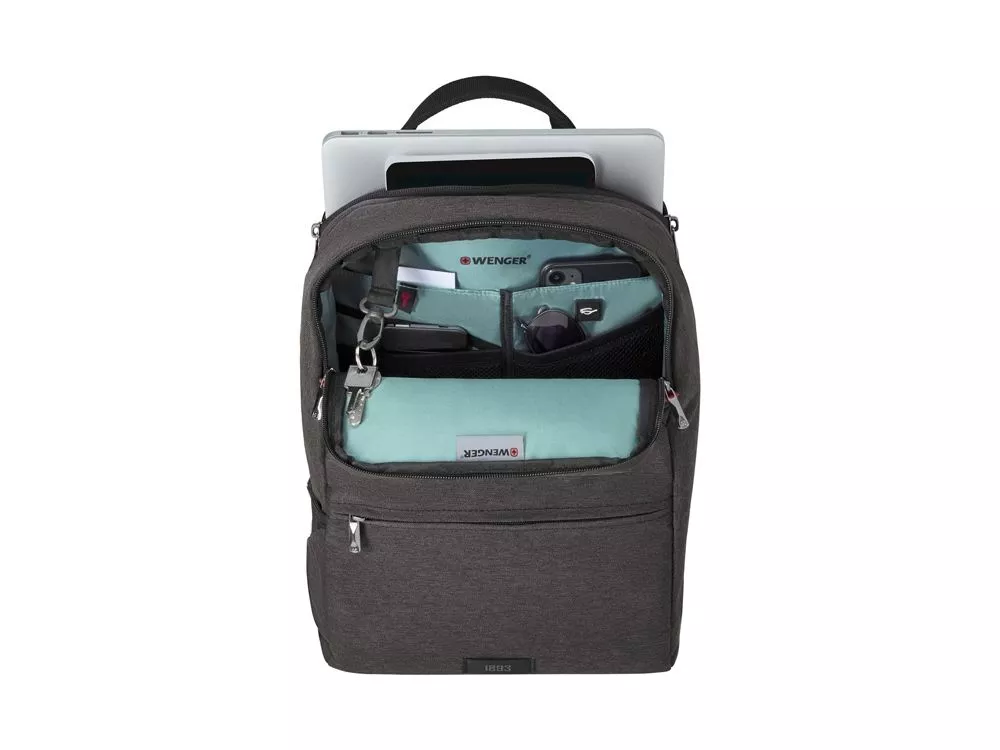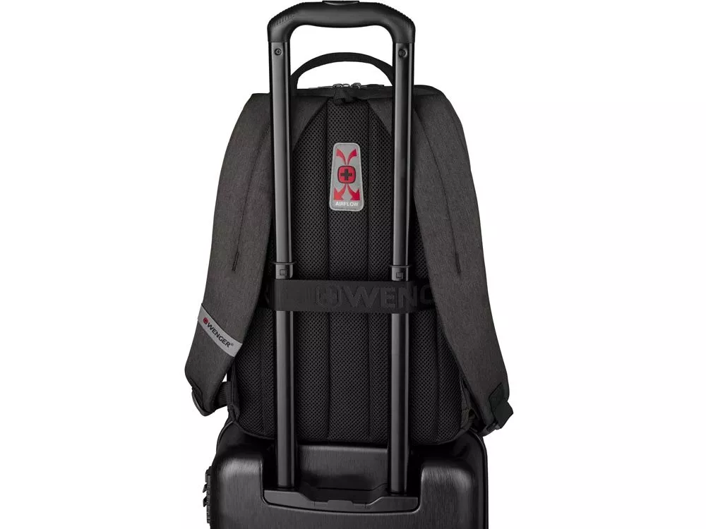 Рюкзак городской WENGER MX Reload с отделением для ноутбука 14. Функциональная организация: - Мягкое отделение для ноутбука с диагональю до 14 дюймов и специальным отсеком для ноутбука/планшета до 10 дюймов. - Карман-органайзер для упорядоченного хранения мелких предметов: шнуров питания, зарядных устройств, визитных карточек, пишущих принадлежностей и пр. - Карман быстрого доступа. - Молния с покрытием с водоотталкивающими свойствами. - Пряжка безопасности S/R. - Спинка с системой циркуляции воздуха Airflow. - Рукав для крепления к чемодану позволяет зафиксировать рюкзак на телескопической ручке чемодана для удобного перемещения нескольких предметов багажа одновременно.