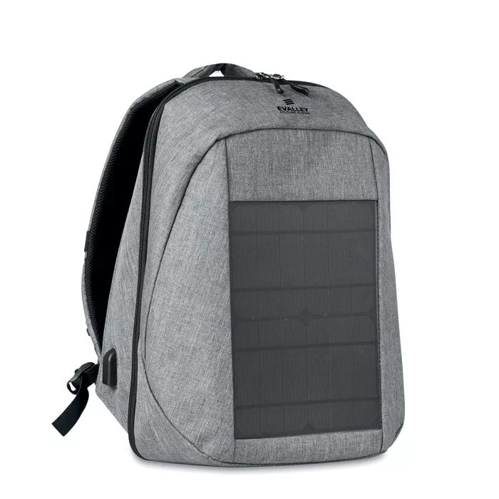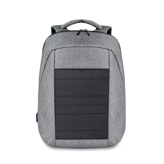 Рюкзак из полиэстера 600D со встроенным зарядным устройством от солнечной батареи с USB-портом и кабелем. Время зарядки составляет около 5-6 часов при прямом солнце. 2 основных отделения. Несколько внутренних карманов. Включает в себя один внутренний отсек для ноутбуков на 13 дюймов. Мягкие спинки и плечевые ремни. Дополнительный карман для планшета.