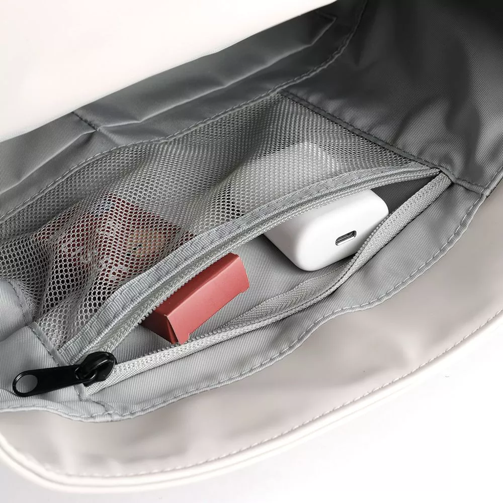 Внутри карман для ноутбука размером до 14 дюймов и 2 открытых кармана для аксессуаров, а также карман-сетка на молнии для арома-саше или других мелочей.