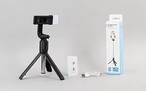 Складной трипод-трансформер с пультом дистанционного управления и съёмной лампой-подсветкой (2 режима яркости, кнопка вкл/выкл находится непосредственно на самой лампе). Пульт соединяется со смартфоном через bluetooth на расстоянии до 10 м. Батарейка для пульта входит в комплект. Длина телескопической ручки - от 18,5 см (в сложенном состоянии) до 69 см (в раздвинутом состоянии). Зажимы для смартфона можно раздвинуть от 6 до 9,5 см, весьма плотно закрепив гаджет.