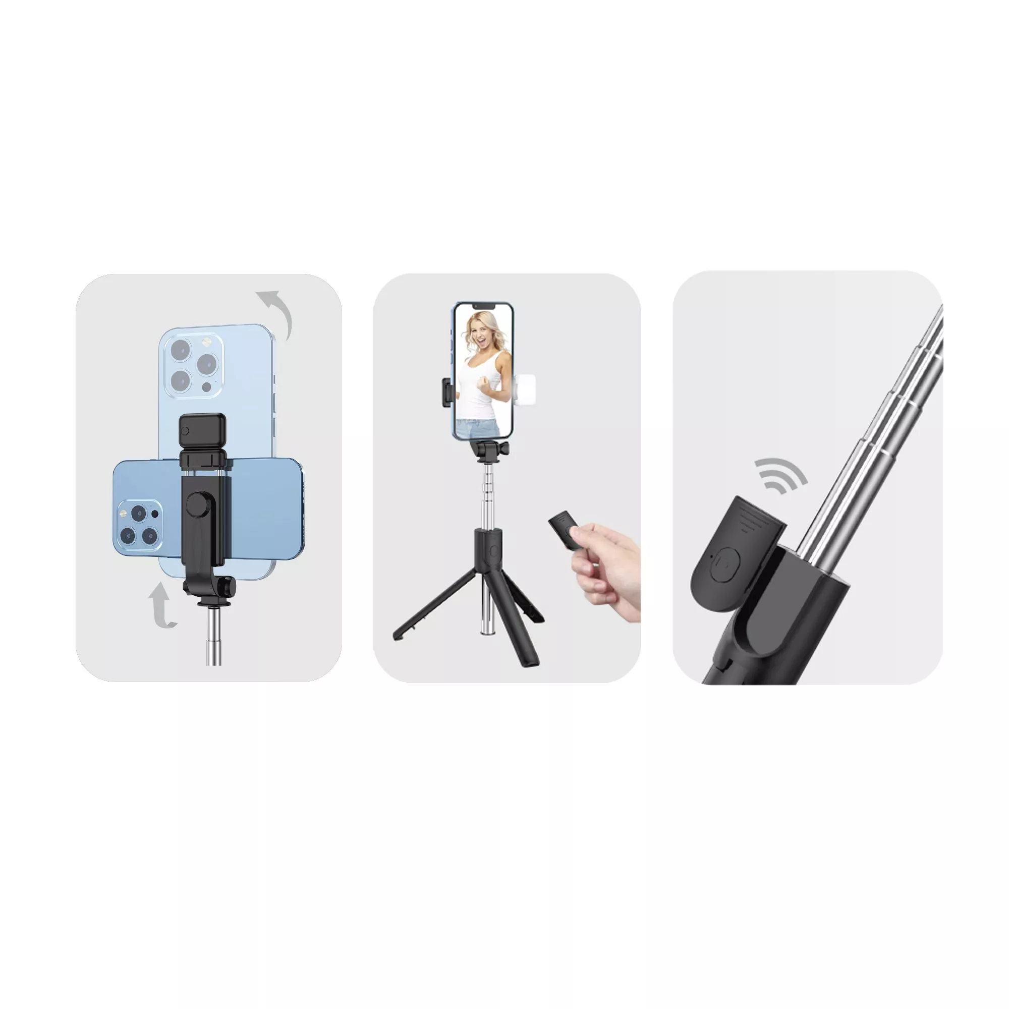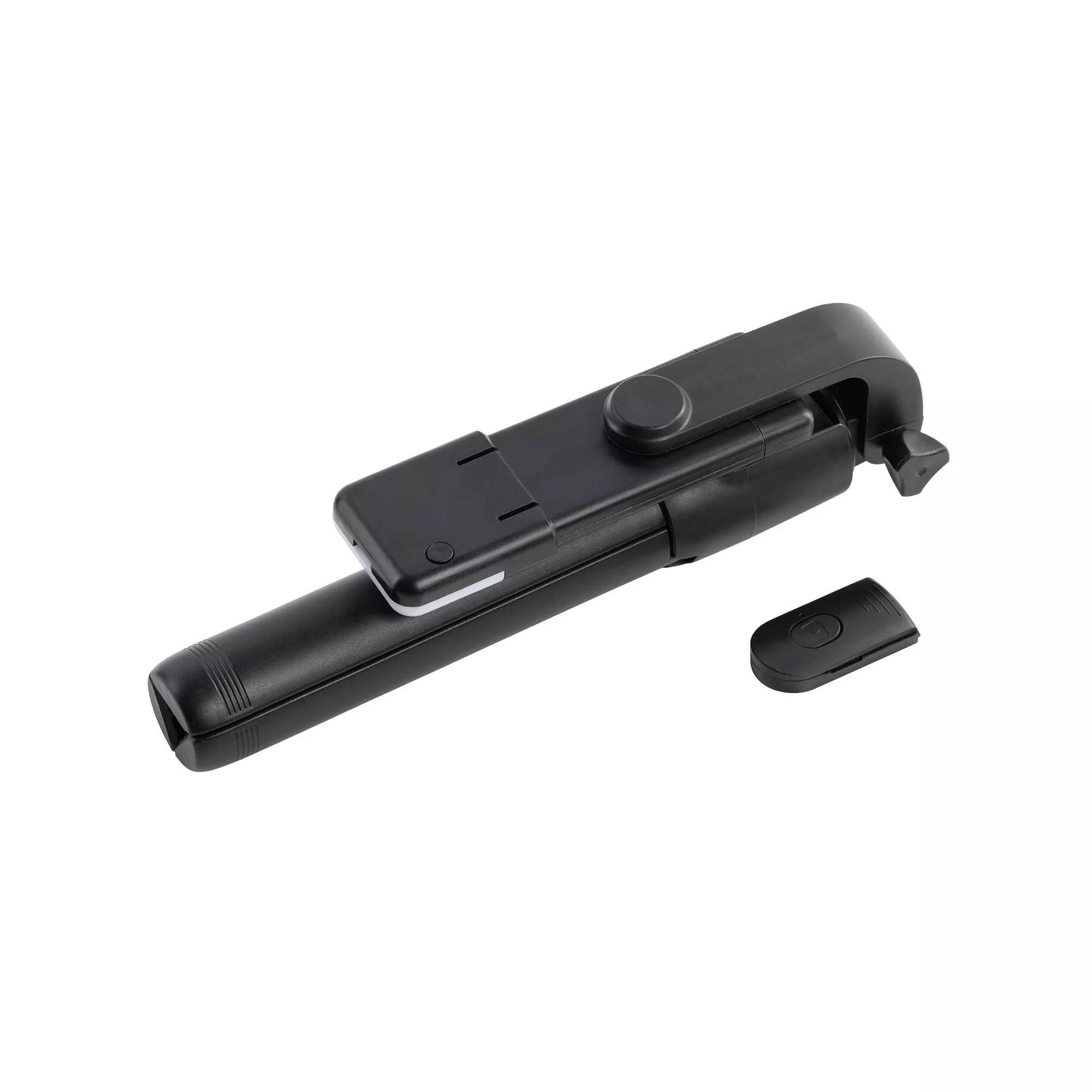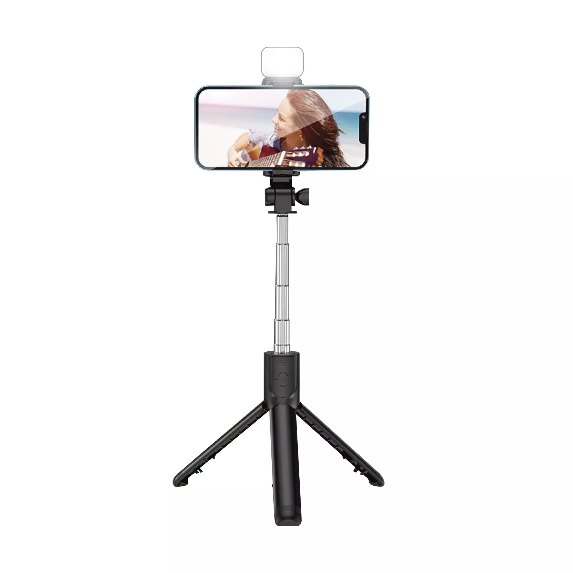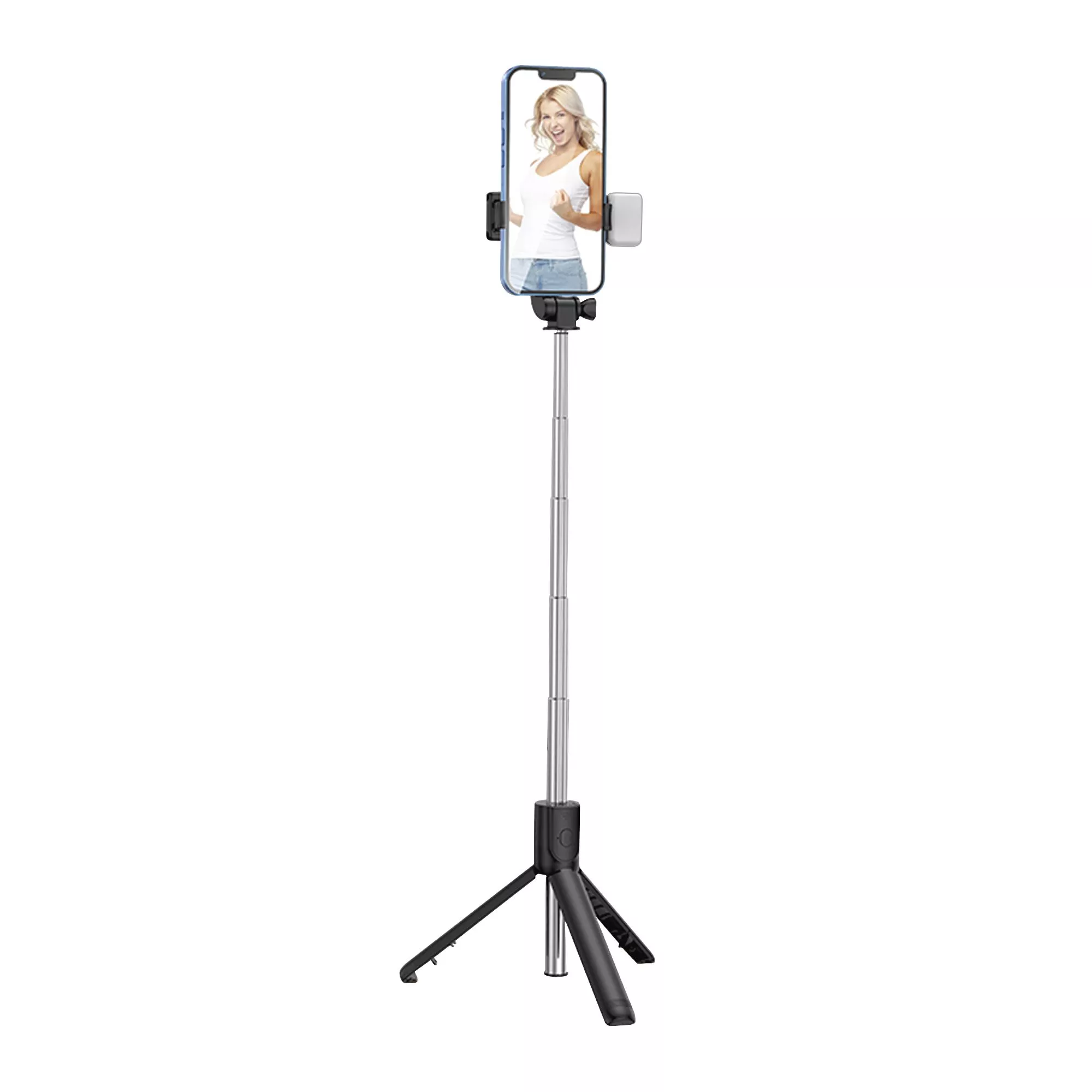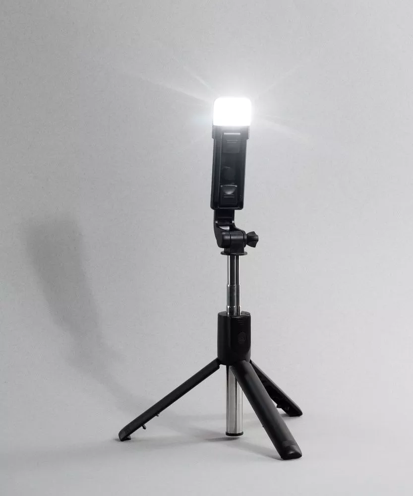 Складной трипод-трансформер с пультом дистанционного управления и съёмной лампой-подсветкой (2 режима яркости, кнопка вкл/выкл находится непосредственно на самой лампе). Пульт соединяется со смартфоном через bluetooth на расстоянии до 10 м. Батарейка для пульта входит в комплект. Длина телескопической ручки - от 18,5 см (в сложенном состоянии) до 69 см (в раздвинутом состоянии). Зажимы для смартфона можно раздвинуть от 6 до 9,5 см, весьма плотно закрепив гаджет.
