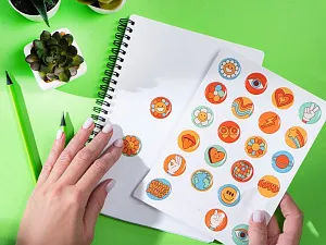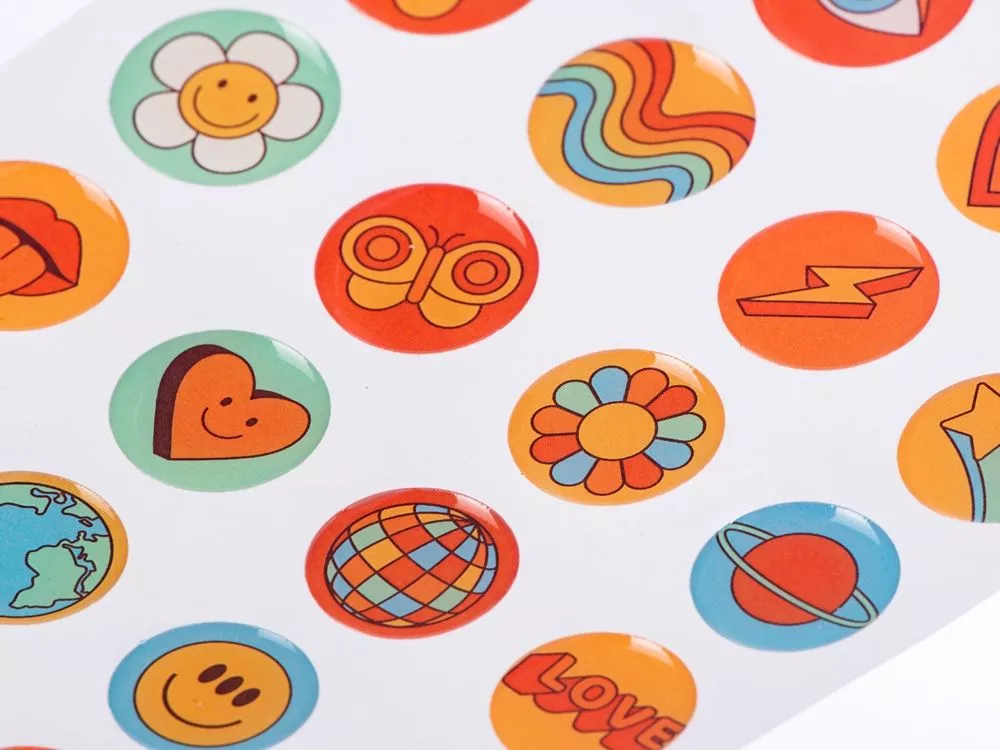 Стикеры из полимерной смолы очень яркие, чёткие и очень привлекательные. Изображение находится внутри выпуклой линзочки и выглядит объёмным. Такой эффект достигается за счёт заливки эпоксидной, или по-другому — полимерной, смолой — она наносится на изображение в жидком виде, а потом застывает, создавая объём и не давая картинке выгорать и повреждаться. Стикеры могут быть круглой, квадратной или прямоугольной формы. Для квадратных и прямоугольных стикеров немного закругляют углы, это необходимо для того, чтобы смола не вытекала при изготовлении. Стикерпаки (Печать стикерпаков) на данный товар осуществляется бесплатно. Оплачивается только настройка оборудования в размере 700 рублей на весь тираж.