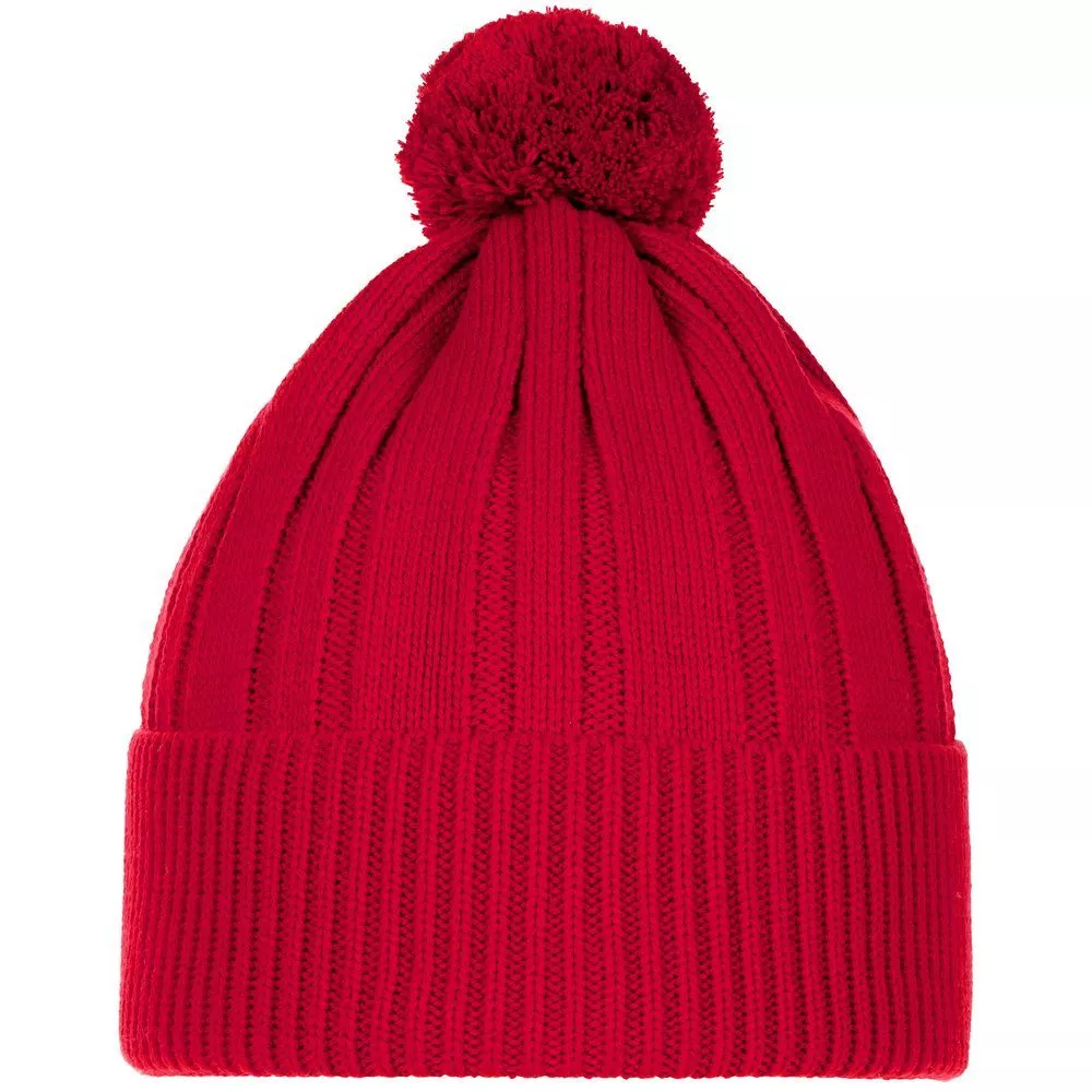 Однослойная шапка фактурной вязки с помпоном и широким отворотом.