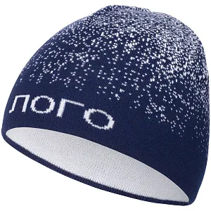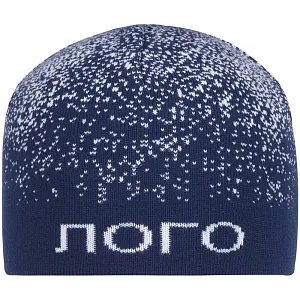 Шапка с вывязанным логотипом и индивидуальным рисунком в фирменной цветовой гамме.