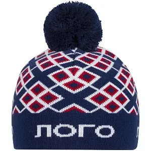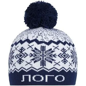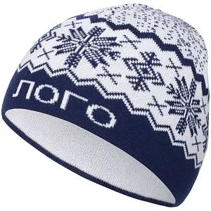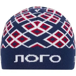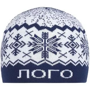 Шапка с вывязанным логотипом и индивидуальным рисунком в фирменной цветовой гамме.