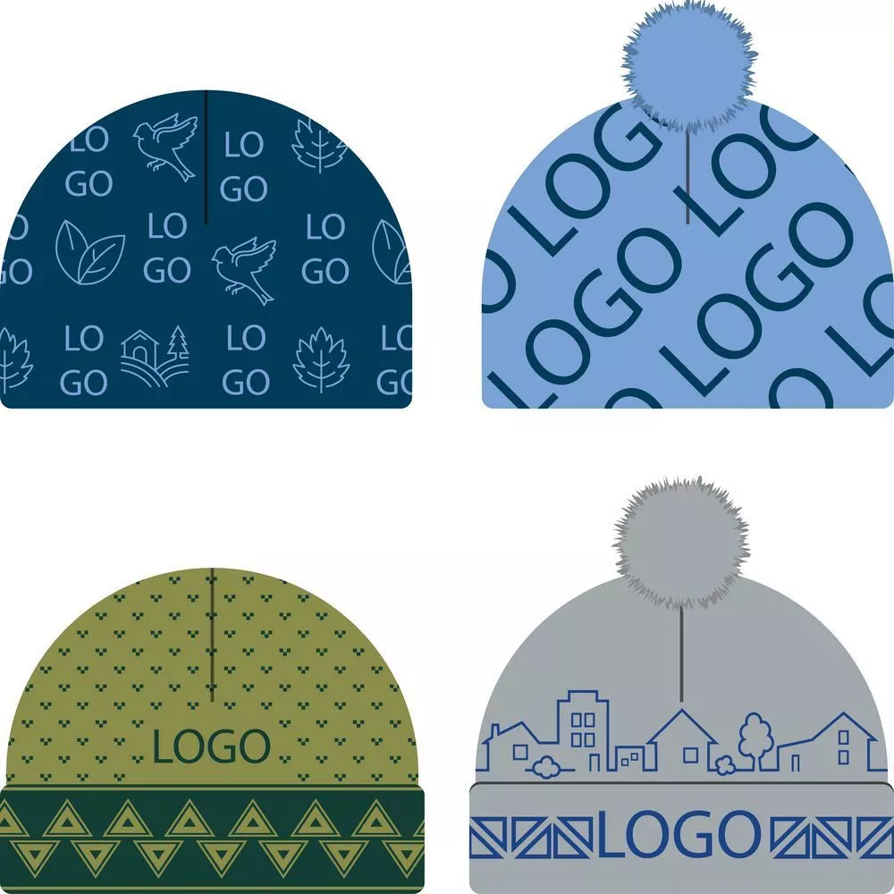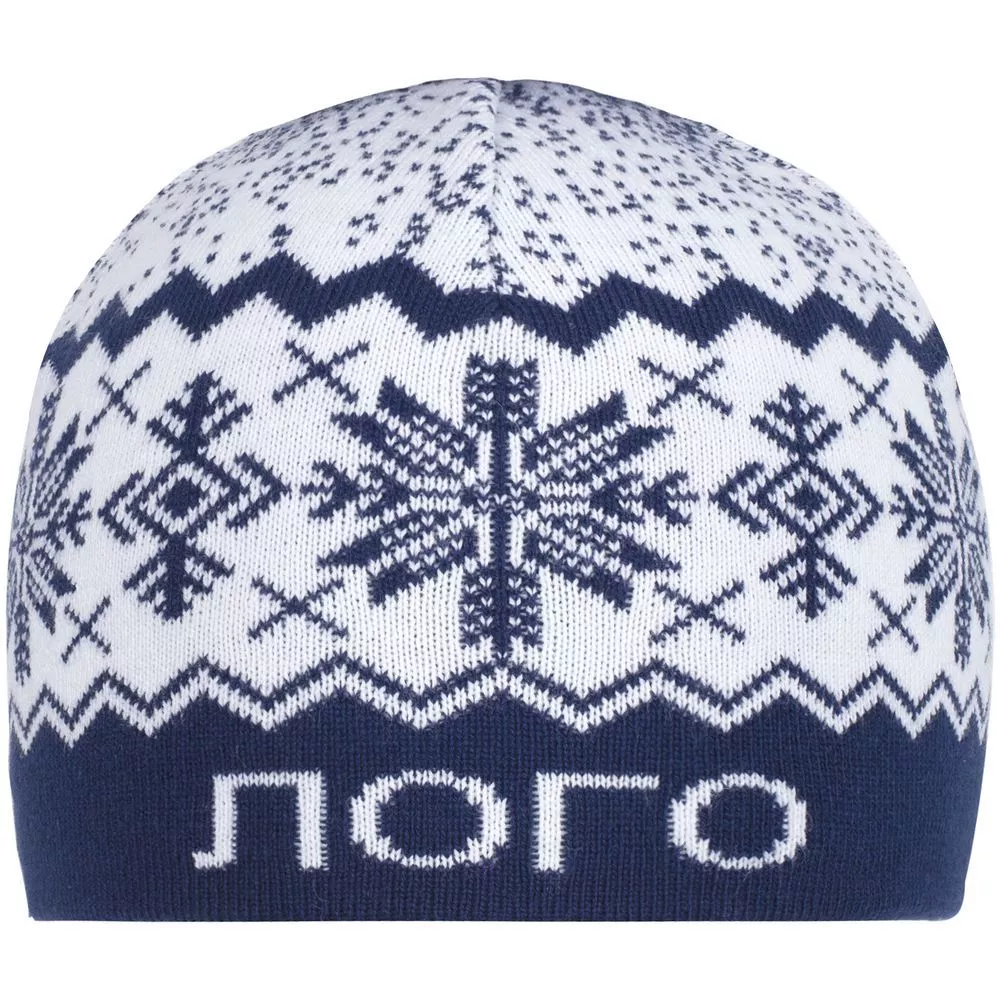 Шапка с вывязанным логотипом и индивидуальным рисунком в фирменной цветовой гамме.