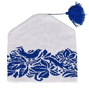 Шапка-петушок с вывязанным логотипом и индивидуальным рисунком в фирменной цветовой гамме.