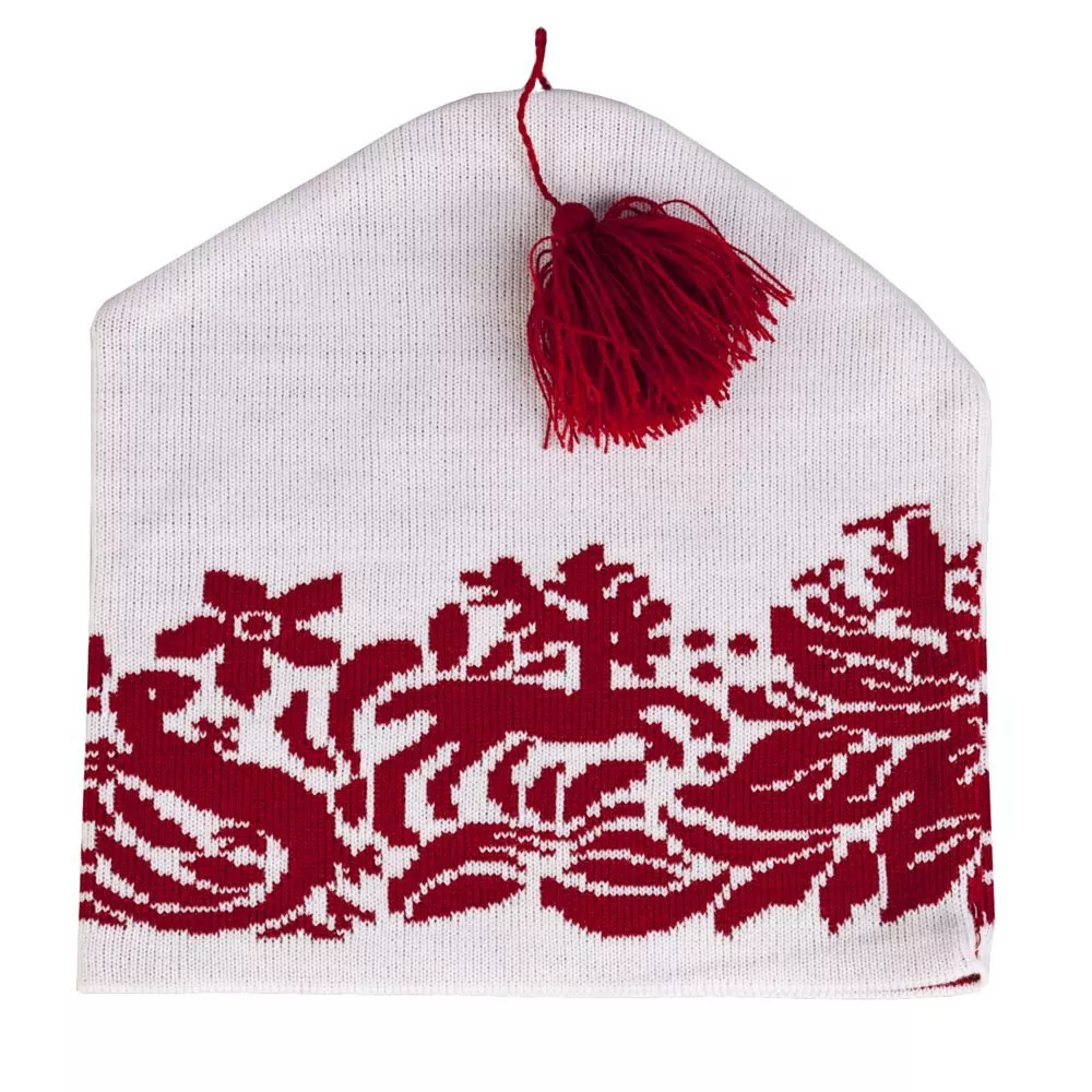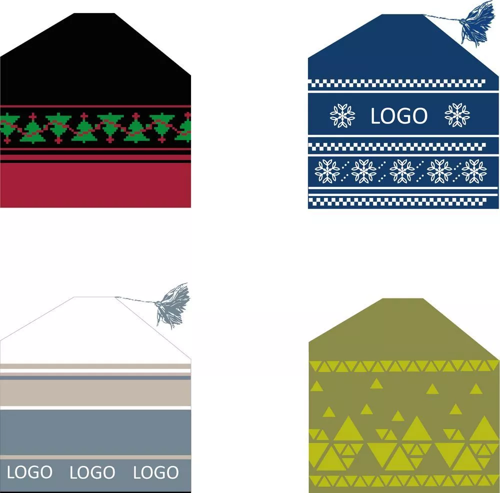 Шапка-петушок с вывязанным логотипом и индивидуальным рисунком в фирменной цветовой гамме.