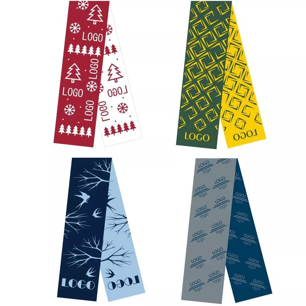 Шарф с вывязанным логотипом и индивидуальным рисунком в фирменной цветовой гамме.