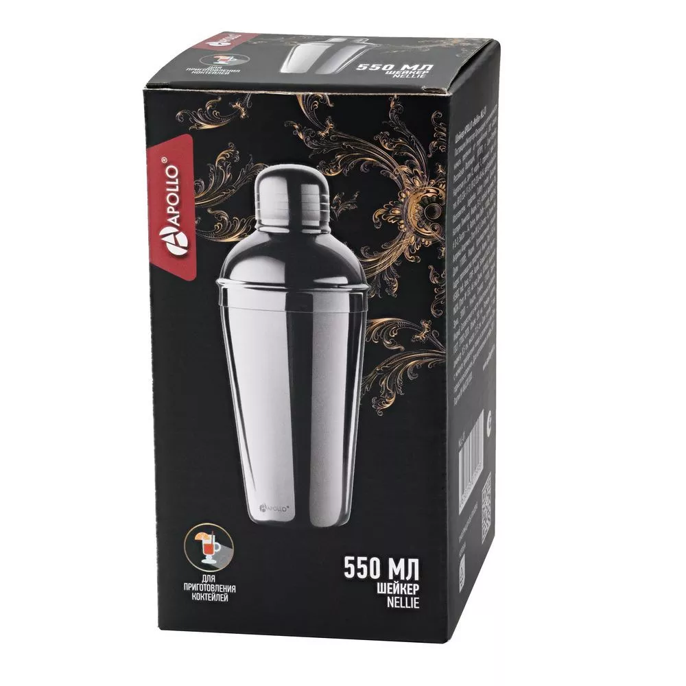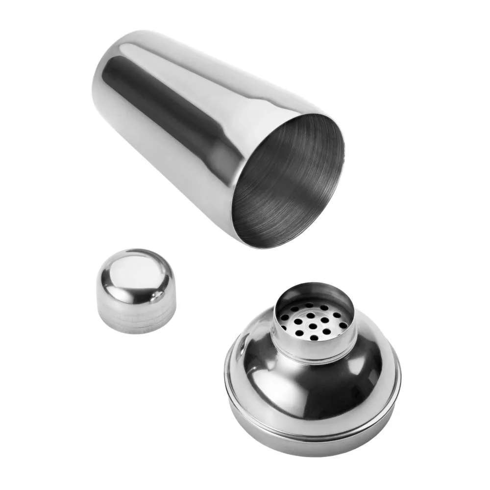 Классический шейкер для приготовления алкогольных и безалкогольных коктейлей и других смешанных напитков, например, холодного кофе фраппе или спортивного питания с протеином. Выполнен из нержавеющей стали и снабжен ситечком для фильтрации.