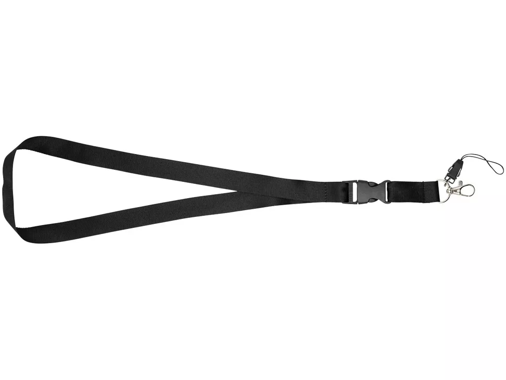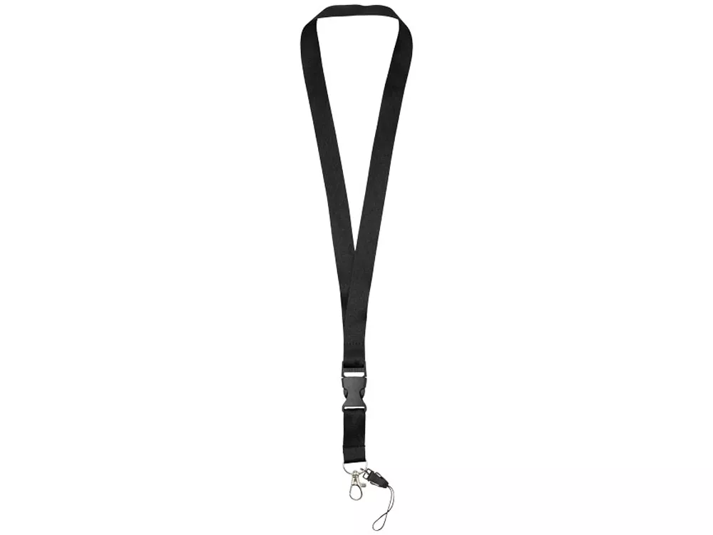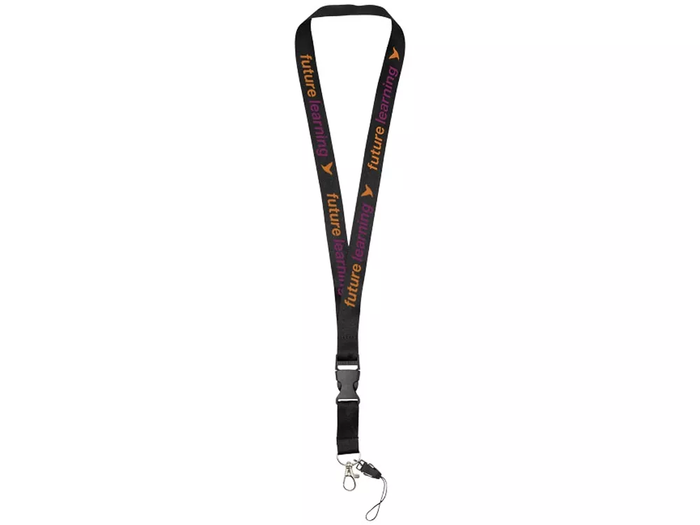 Многофункциональный шнурок с отстегивающейся пряжкой, овальным крючком с зажимом и держателем для телефона. Идеально подходит для бейджа, удостоверения личности или ключей. Предлагается широкий выбор цветов с большим участком для нанесения логотипа. Полиэстер.