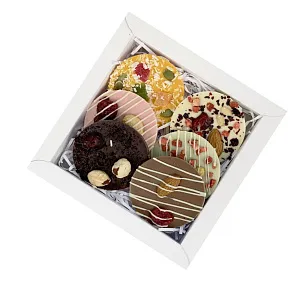 Шоколадные конфеты Mendiants — это яркий праздничный комплимент и настоящее гастрономическое путешествие.В наборе 6 медиантов с разными вкусами: медиант из молочного шоколада с сублимированной малиной и миндалем; медиант из лаймового шоколада с фисташкой и сублимированной клубникой; медиант из темного шоколада с фундуком, клюквой и черной смородиной; медиант из белого шоколада с клюквой, кедровым орехом; медиант из апельсинового шоколада с тыквенной семечкой и цукатами; медиант из клубничного шоколада с клубникой и миндалем.