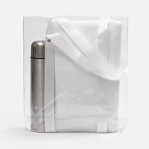 Прозрачные сумки никогда не выйдут из моды. А цветные ручки легко впишутся в брендбук и точно передадут настроение, которое хотелось бы транслировать.