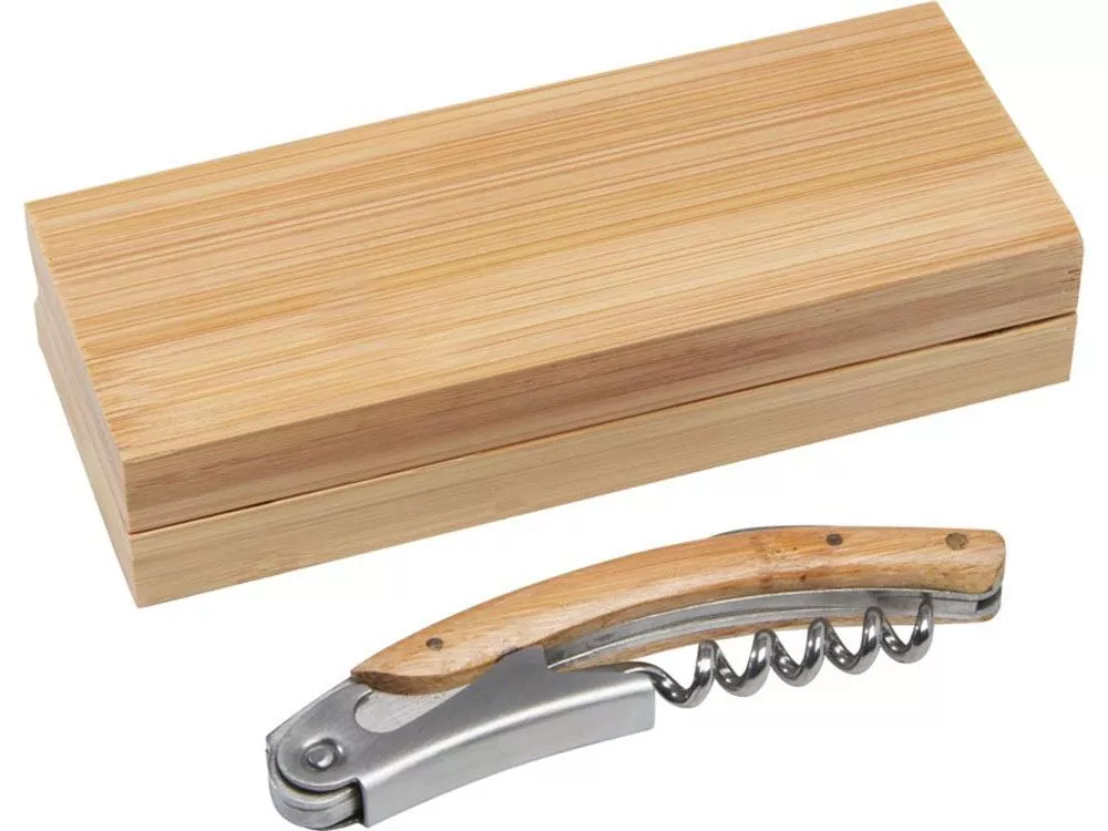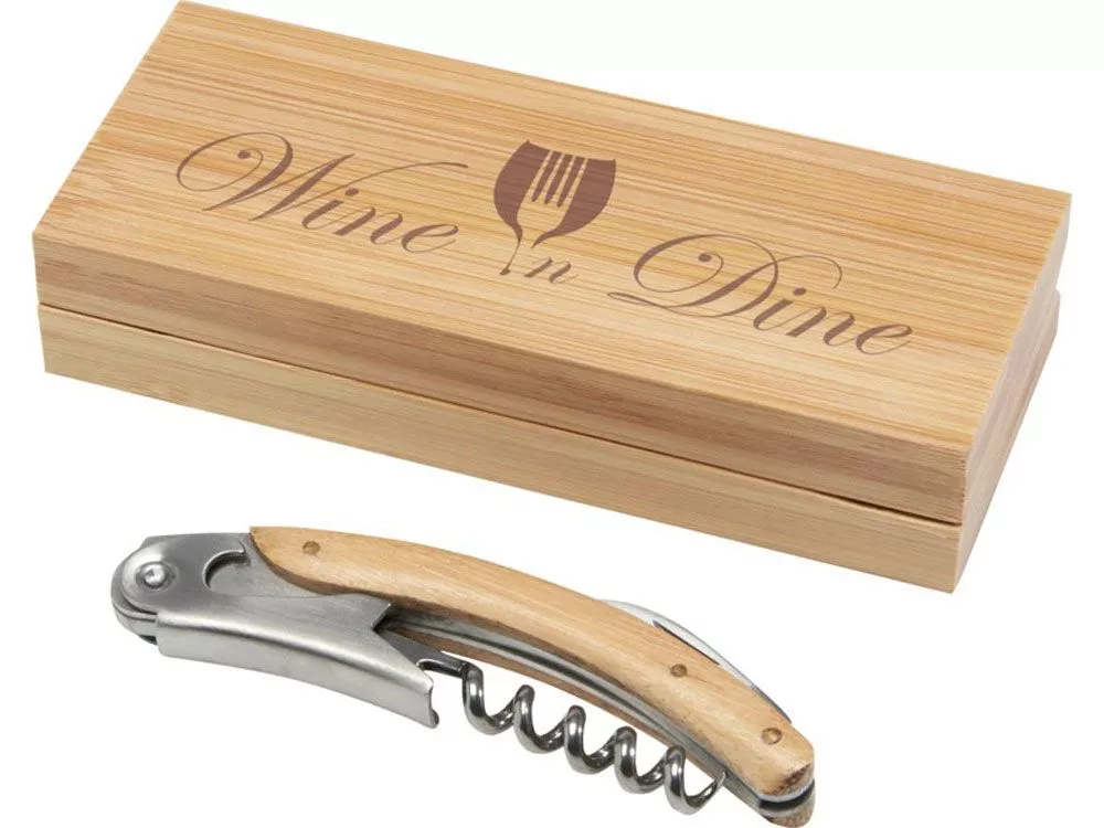 Нож официанта из нержавеющей стали со штопором и складным ножом для фольги и ручкой из натурального бамбука. Используемый бамбук поставляется и производится в соответствии со стандартами устойчивого развития.