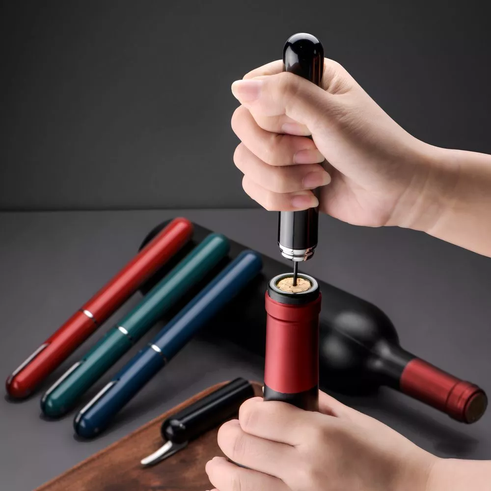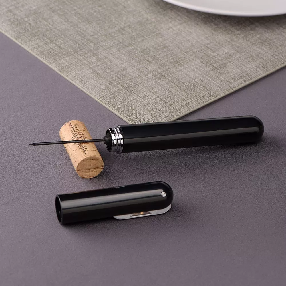 Компактный вакуумный штопор для вина с ножом. В отличии от механического штопора, вакуумный штопор не требует больших усилий и всегда готова к использованию. Так же он не крошит пробку. Оригинальный подарок в набор бармена.