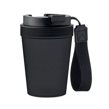 Single wall tumbler in PP, with RPET polyester strap. Leak-free. Capacity: 300 ml. As this is a single walled tumbler, heat transfer can still occur.