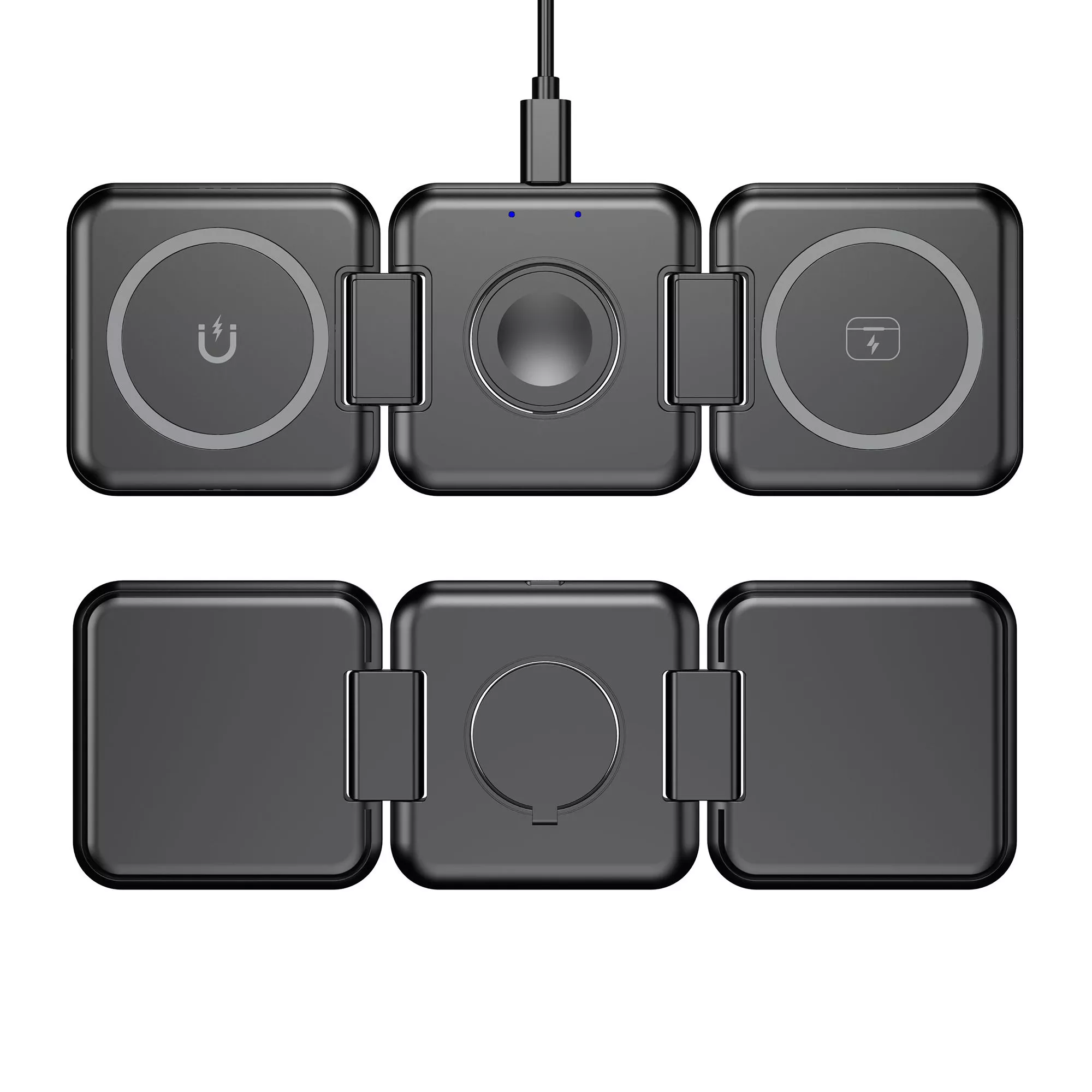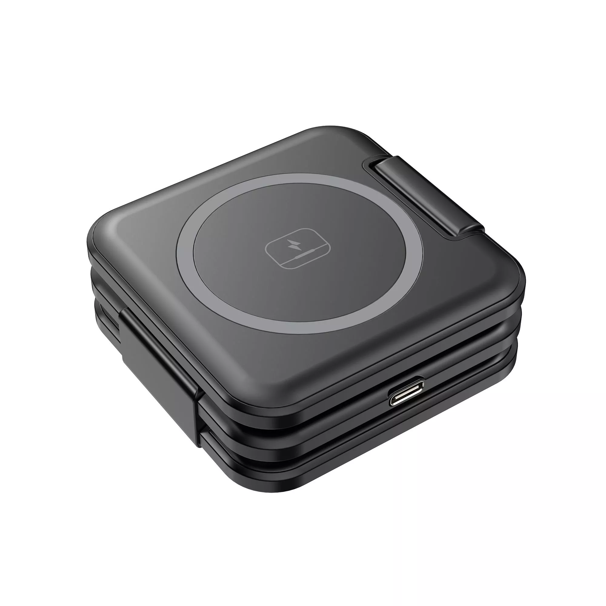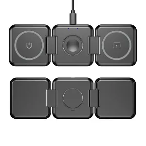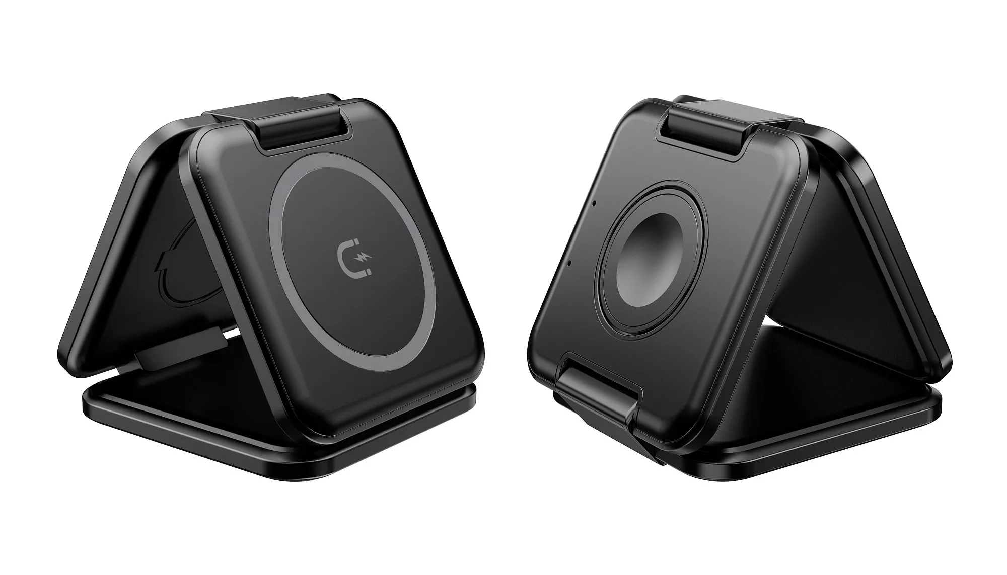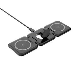 Зарядный блок станции для смартфона оснащён функцией MagSafe – магнитным держателем для iPhone двенадцатой серии и выше. Встроенные магниты слева от зарядного блока для смартфона и справа от зарядного блока для наушников позволяют сложить станцию в пирамиду-подставку - в данном положении появляется возможность закрепить iPhone горизонтально для удобного просмотра фото/видео на его экране.