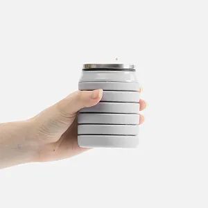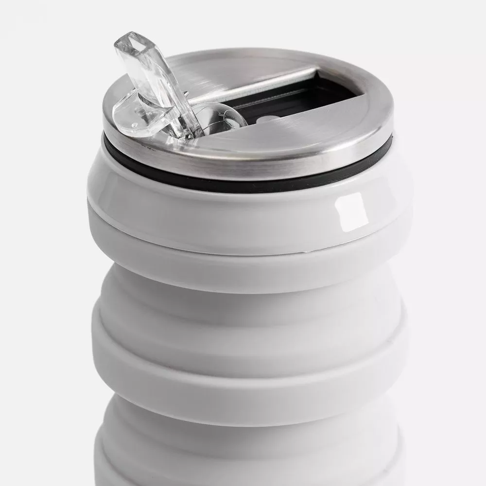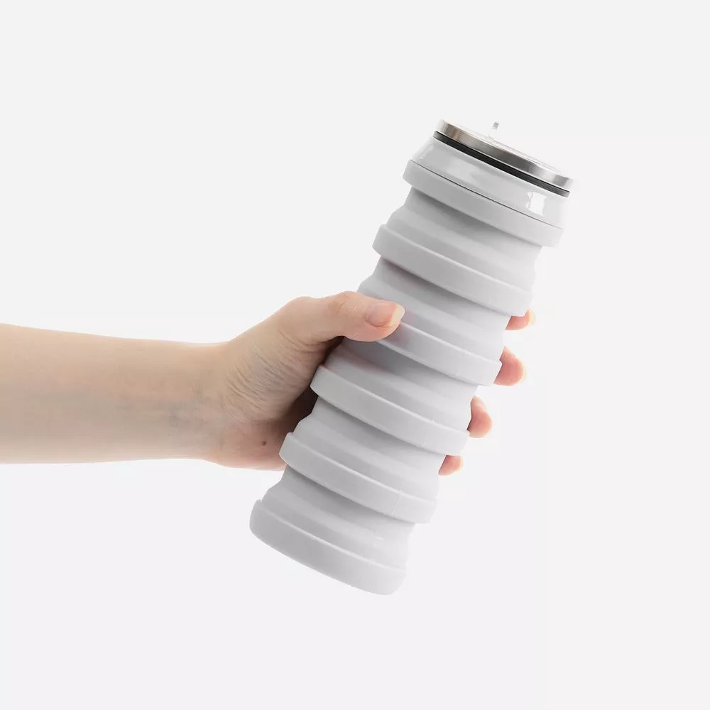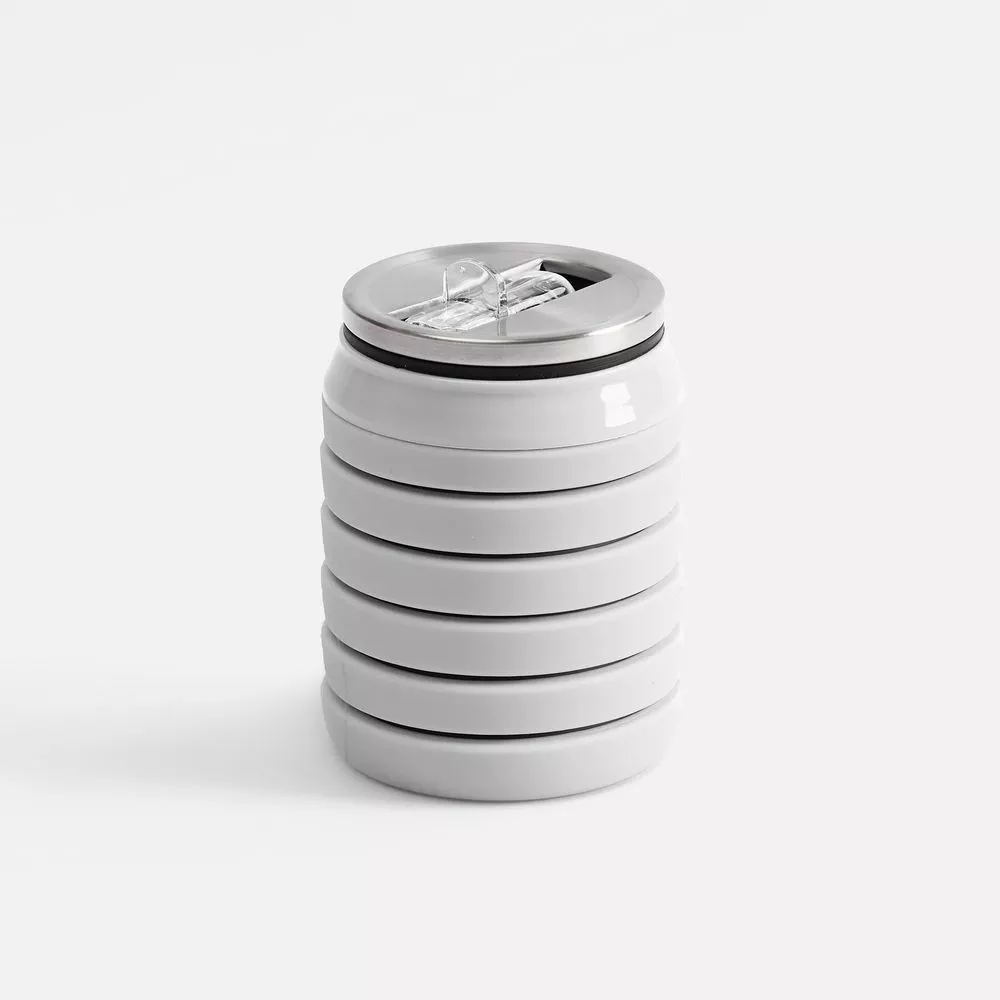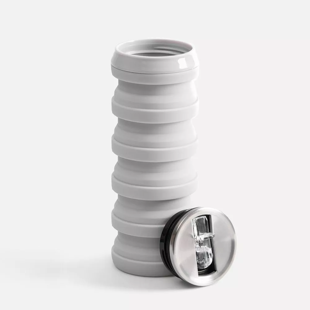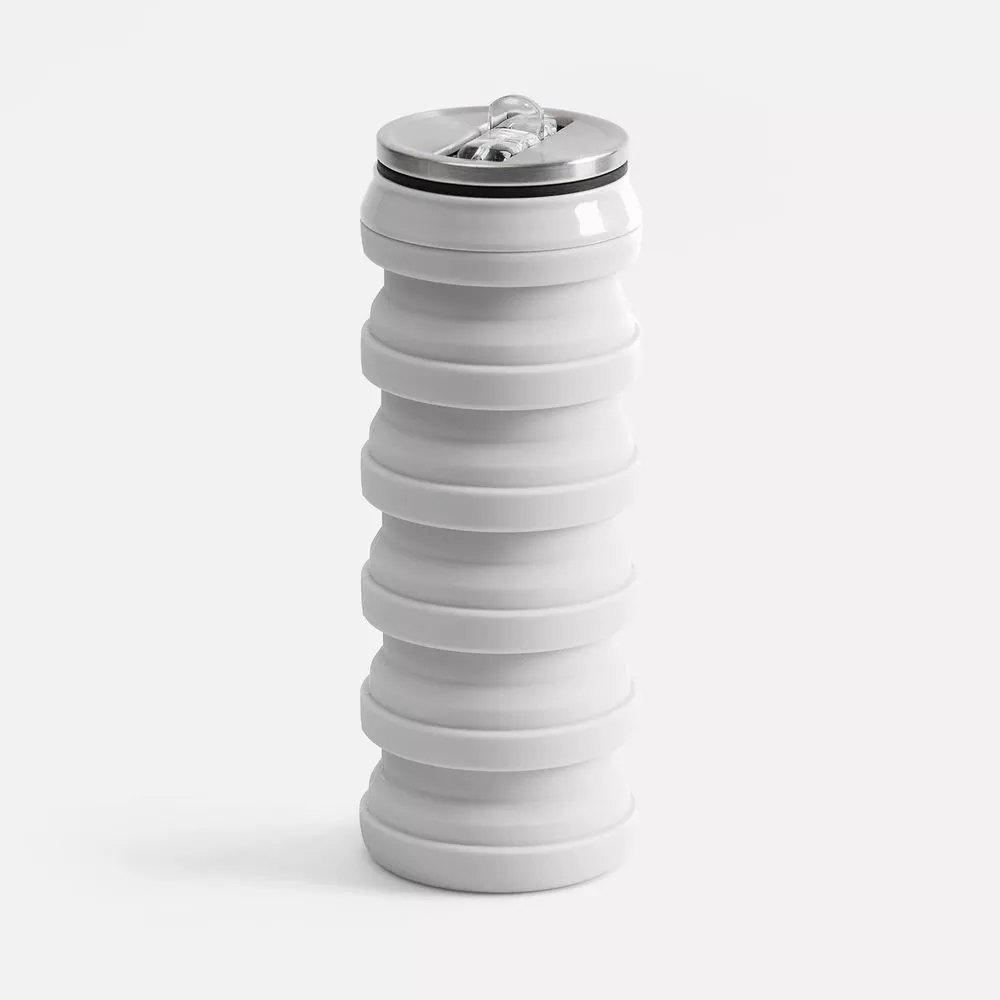 Складная бутылка для воды Folla привлекает внимание своим необычным внешним видом и функциональностью. По форме она больше всего напоминает классическую алюминиевую банку для напитков, высоту которой можно легко увеличить с 10 до 20 см. В сложенном виде бутылка поместится даже в небольшую сумочку, а полный полезный объем в разложенном виде составляет целых 480 мл. Подходит для горячих и холодных напитков.