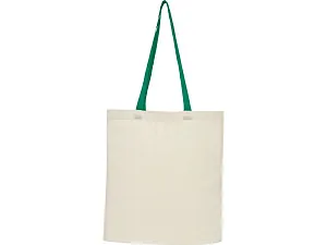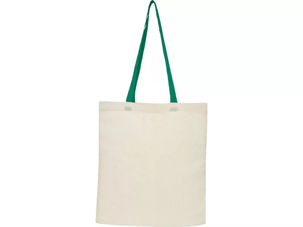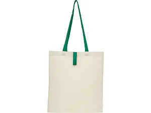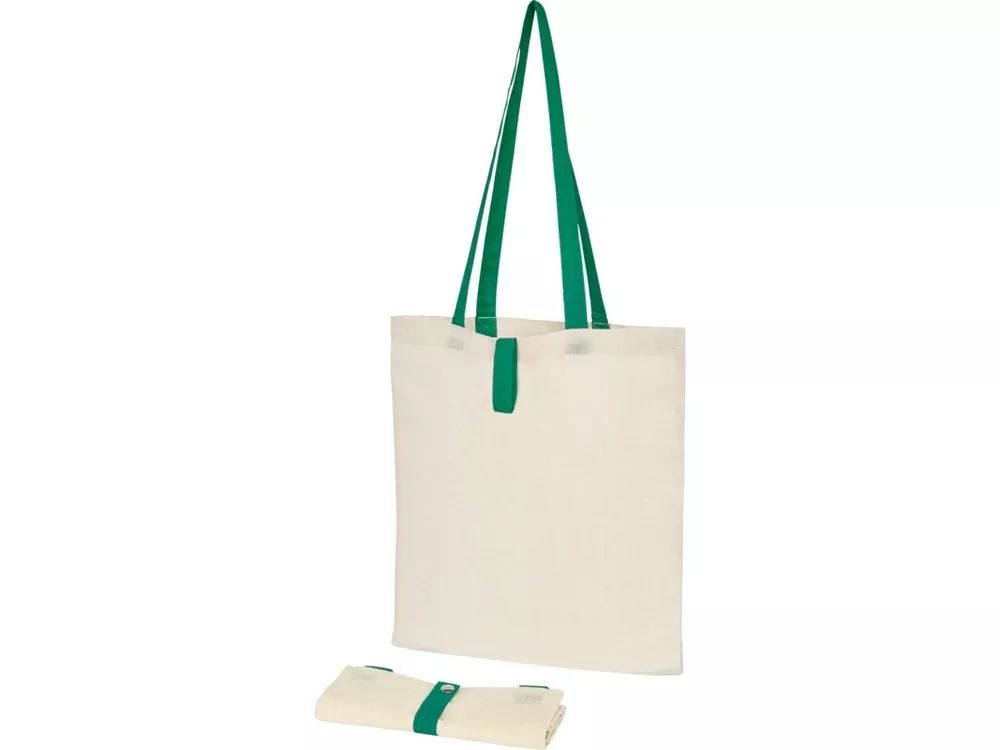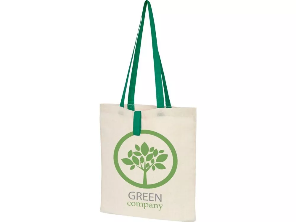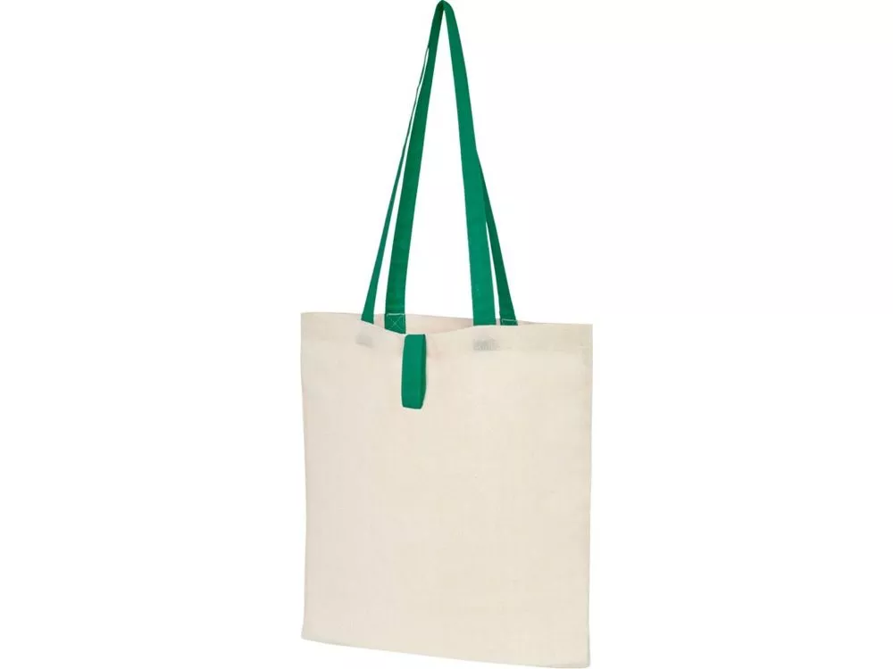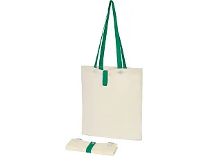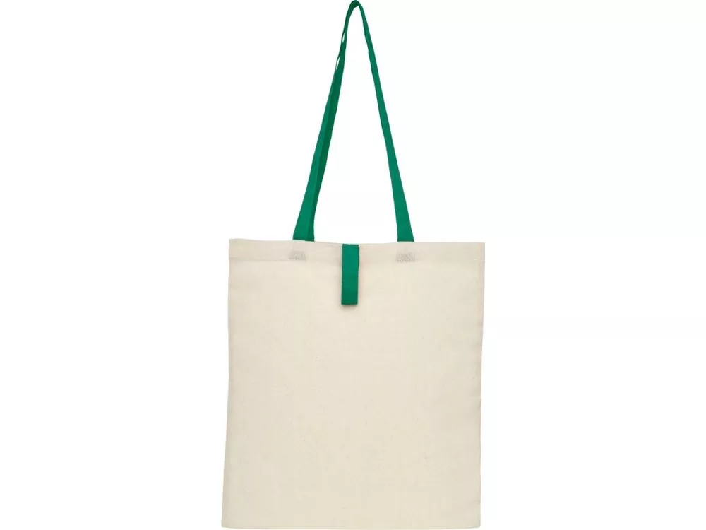 Эко-сумка с открытым основным отделением и цветными ручками, раскладывающаяся в высоту на 32 см. Имеет ремень с пуговичной застежкой, чтобы закрывать сумку. Прочность до 8 кг.