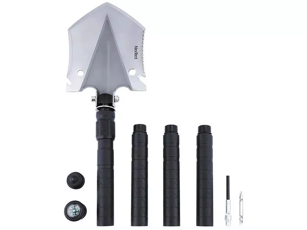 NexTool Multifunction Shovel Big – складная многофункциональная лопата, которая оснащена массой инструментов: пилой, шестигранным ключом, открывалкой, отверткой, огнивом, свистком, аварийным молотком и компасом. Рукоятка лопаты обладает длинной 76 сантиметров и состоит из 4 отсоединяемых частей. Инструмент выполнен из прочного алюминиевого сплава и выдерживает нагрузки до 1800 килограмм. Рукоятка лопаты обладает большим набором инструментов: отверткой, огнивом, свистком, аварийным молотком и компасом. Кроме того, в случае необходимости вы сможете разобрать рукоятку на 4 отдельных частей для более удобного хранения лопаты. Полотно лопаты оснащено пилой, шестигранным ключом и открывалкой. Благодаря этому вы сможете использовать лопату как многофункциональный инструмент. Дополнительно присутствует возможность изменять угол наклона полотна.