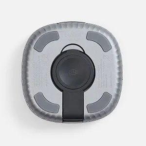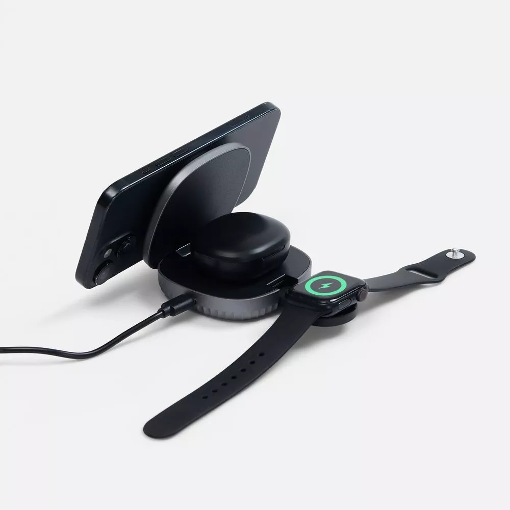 В сложенном состоянии площадки для зарядки смартфона и наушников расположены друг над другом, а зона зарядки умных часов убирается в специальный паз, поэтому станцию легко сложить в аккуратный бокс.