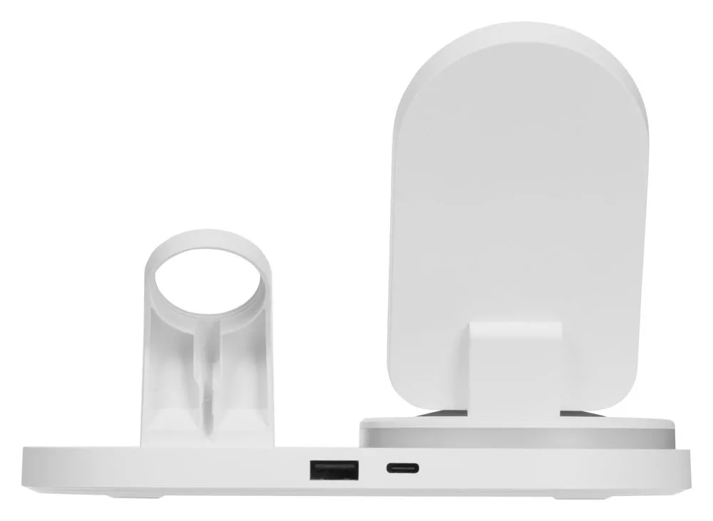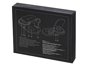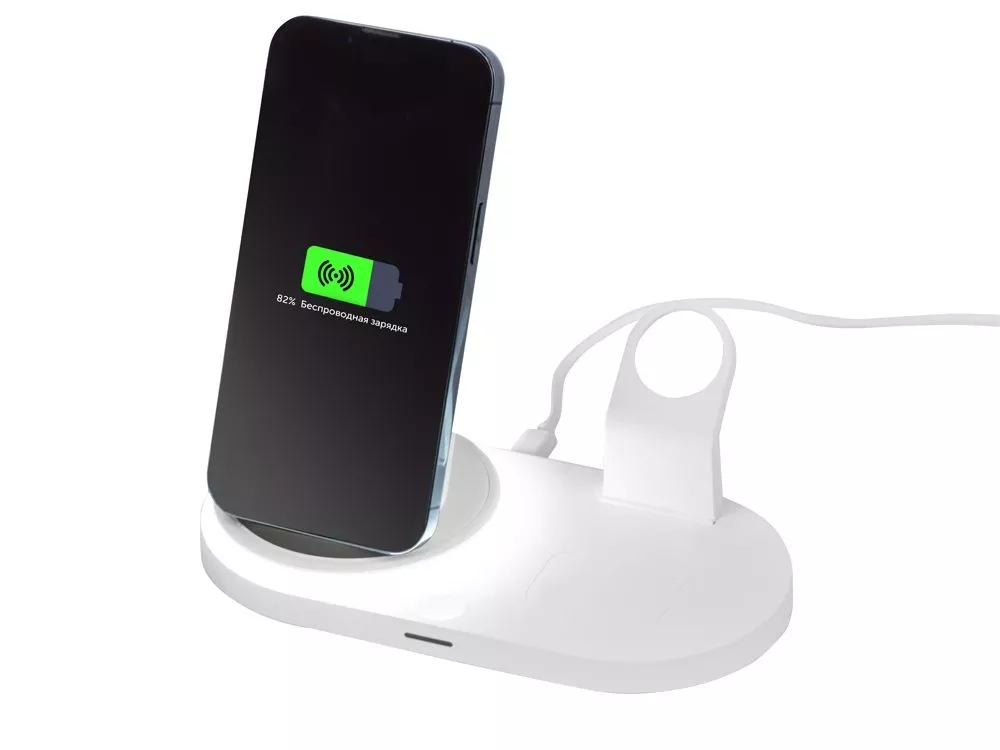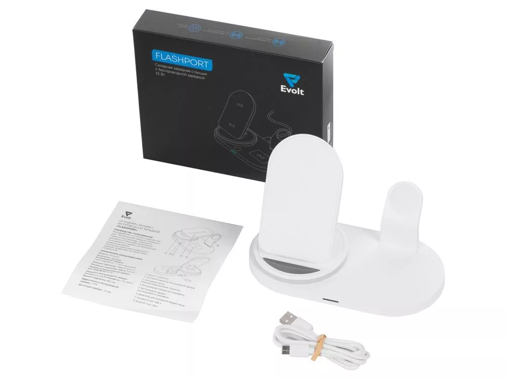 Flashport от Evolt - это складная зарядная станция с беспроводной зарядкой для телефона и наушников. В комплекте также идет подставка под зарядку для наручных смарт-часов. На регулируемой панели зарядки смартфона расположены 2 катушки (2 центра беспроводной зарядки), которые позволяют заряжать ваш девайс как в вертикальном, так и горизонтальном положении. Беспроводная зарядка для наушников мощностью 5 Вт подходит для зарядки не только беспроводных наушников, но и второго смартфона. Чтобы включить встроенную лампу, нажмите сенсорную кнопку 1 раз. Для плавного изменения яркости света нажмите и удерживайте сенсорную кнопку при включенной лампе. Кабель 100 см в комплекте. • Быстрая беспроводная зарядка смартфона 15 Вт • Беспроводная зарядка наушников 5 Вт • Лампа-диммер яркостью до 800 Лм • Дополнительный порт USB-A для зарядки внешних устройств Тампопечать (1 цвет (белые изделия)) на данный товар осуществляется бесплатно. Оплачивается только настройка оборудования в размере 4000 рублей на весь тираж.