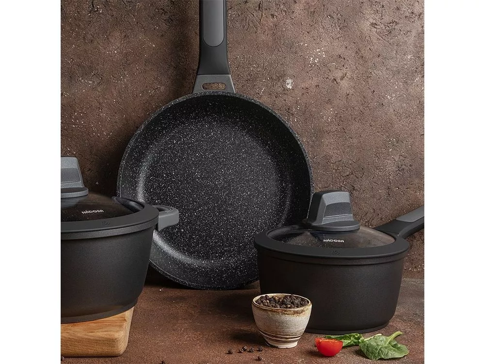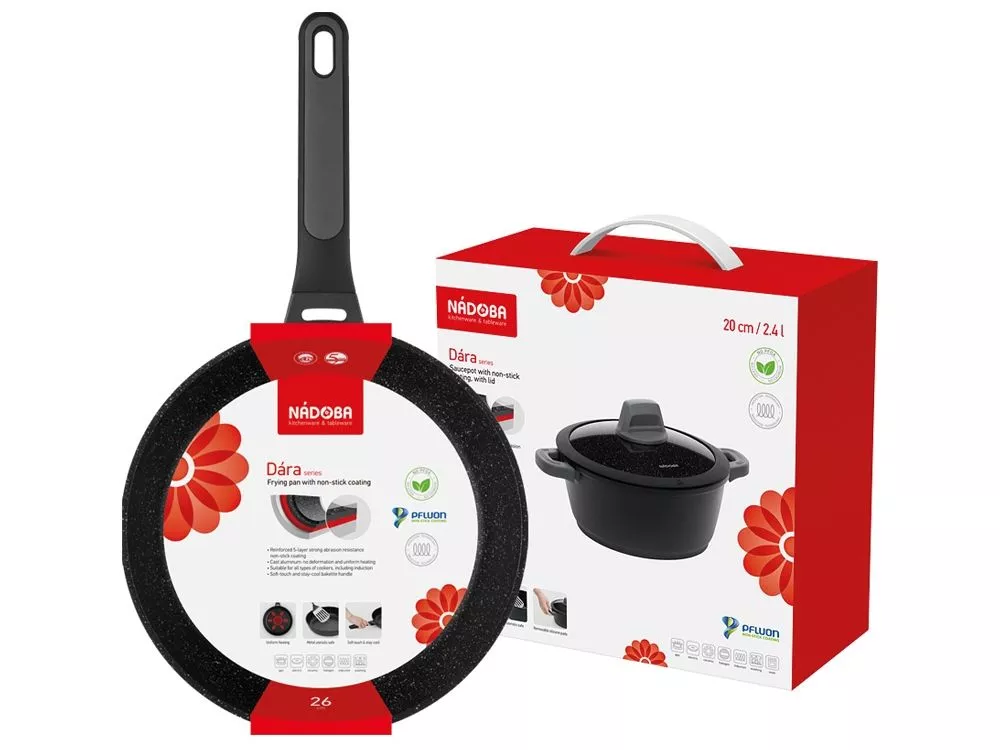 Продукция серии Dara изготовлена из литого алюминия с использованием особо прочного 5-слойного антипригарного покрытия Pfluon, обладающего прекрасными антипригарными свойствами, прочностью и износостойкостью, благодаря чему посуда подходит для ежедневного использования и будет служить не один год. В серию NADOBA Dara входят сковороды 20, 24, 26, 28 см, глубокая, блинная, кастрюля, ковш и сотейник. - Антипригарное покрытие Pfluon не содержит PFOA, кадмий, свинец, а также любых других вредных веществ и полностью безопасно. - Высокая прочность антипригарного покрытия позволяет использовать в работе с посудой неострые металлические инструменты. - Массивный корпус из литого алюминия обеспечивает равномерный нагрев всей поверхности посуды и не деформируется при нагревании или после частого использования. - Ручки выполнены из материалов, предотвращающих их выскальзывание из рук, и не нагреваются. Съёмные силиконовые накладки на ручки позволяют использовать кастрюлю и сотейник в духовке. - Посуда подходит для всех типов плит, включая индукционные. - Гарантия на алюминиевую посуду серии Dara 5 лет.