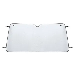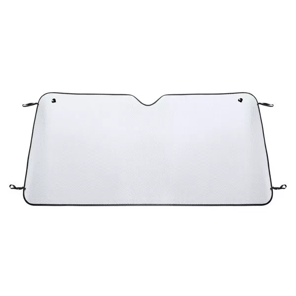 Идеальный большой солнцезащитный экран для грузовиков и микроавтобусов. Обе стороны из пузырчатого алюминия с черной окантовкой. Металлические проушины с присосками и эластичные ремни для складывания прилагаются.