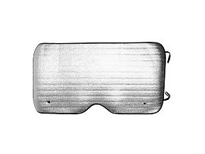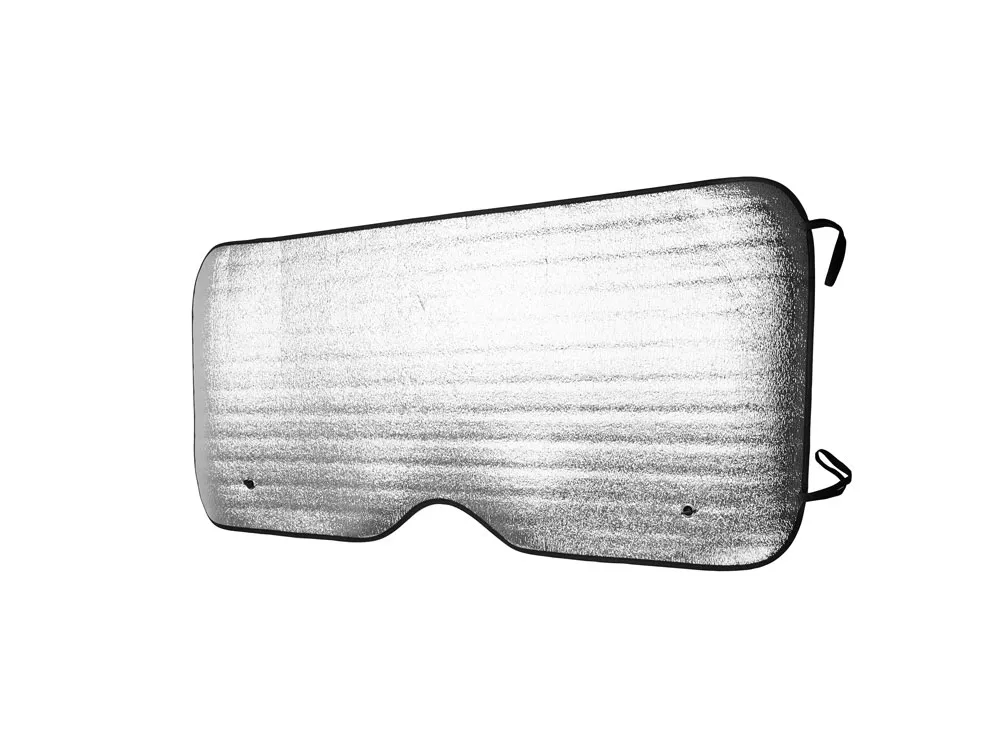 Прямоугольный автомобильный солнцезащитный козырек с алюминиевой передней частью и белой пенопластовой задней частью. Два металлических люверса в обоих верхних углах для присосок. Черная окантовка и эластичные лямки для складывания.