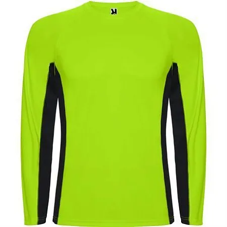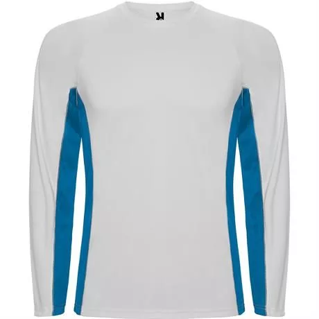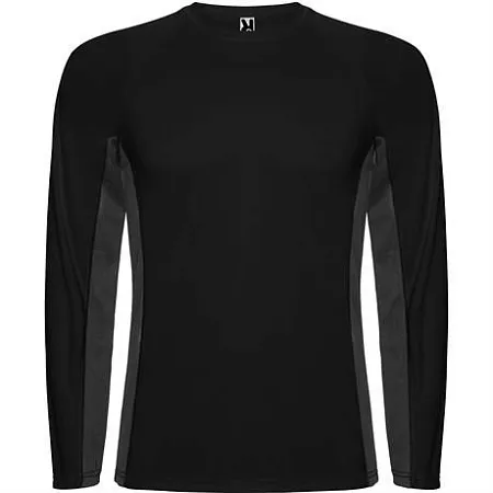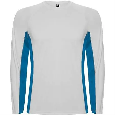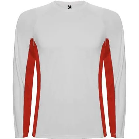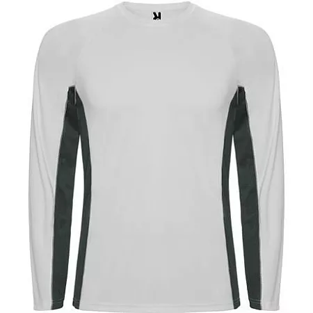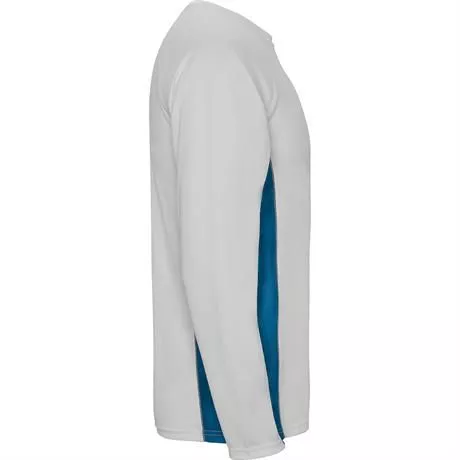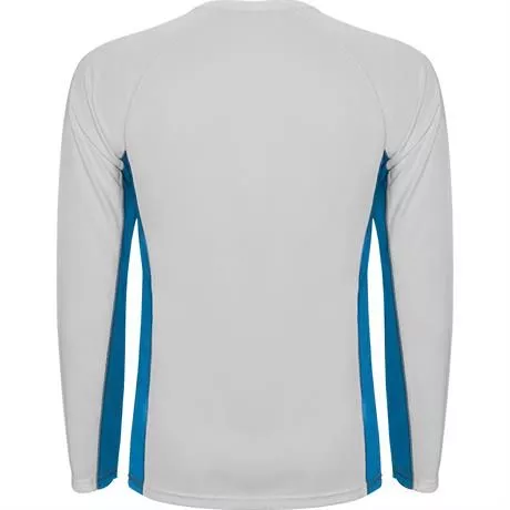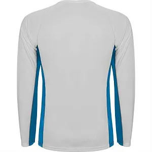 Спортивная футболка из двух комбинированных тканей из полиэстера. Длинные рукава реглан. Основная ткань — bird's eye, а боковые вставки и рукава с внутренней стороны — с микроперфорированной ткани. Круглая горловина с усиленными закрытыми внутренними швам