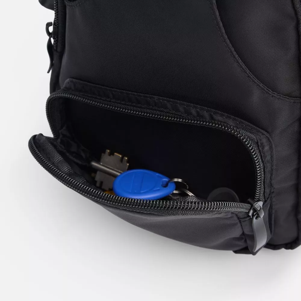 Рюкзак изготовлен из прочного и легкого нейлона, так что обладает высокой стойкостью к износу, а продуманная организация внутреннего пространства позволит удобно разместить телефон, кошелек, ключи и документы. Регулируемый ремень обеспечивает идеальную посадку, потайной карман на задней части надежно защитит самое ценное.