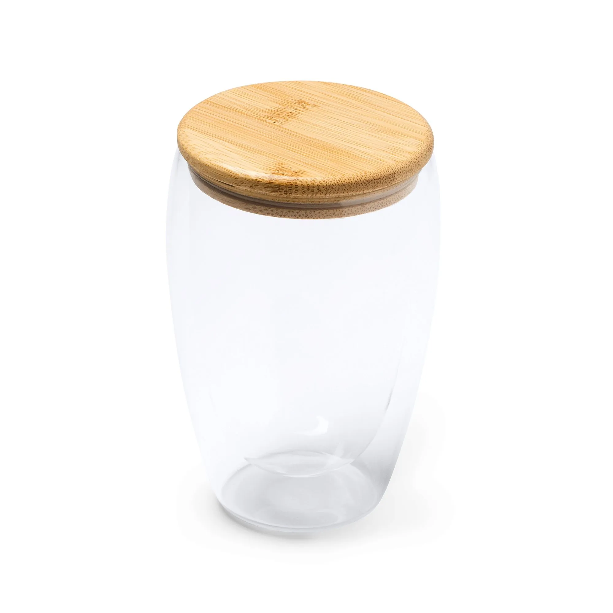 Двустенный стакан из боросиликатного стекла с бамбуковой крышкой. Идеально подходит для подарков и сюрпризов вашим клиентам. Емкость 350 мл.