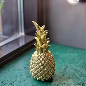Золотой ананас - стильная вещица для украшения современного интерьера. Статуэтка сделана из современного полимерного материала, из которого производят прочные и долговечные изделия домашнего обихода. Стильная и оригинальная композиция "Золотой Ананас" станет прекрасным декоративным украшением для вашего интерьера! Этот простой предмет способен преобразить интерьер, создать уют и погрузить в особую атмосферу. Композиция прекрасно подойдет для декора любого интерьера, особенно в стиле модерн. Ее можно поставить в любом месте, где она будет удачно смотреться и радовать глаз. Кроме того, это отличный вариант подарка для ваших близких и друзей.