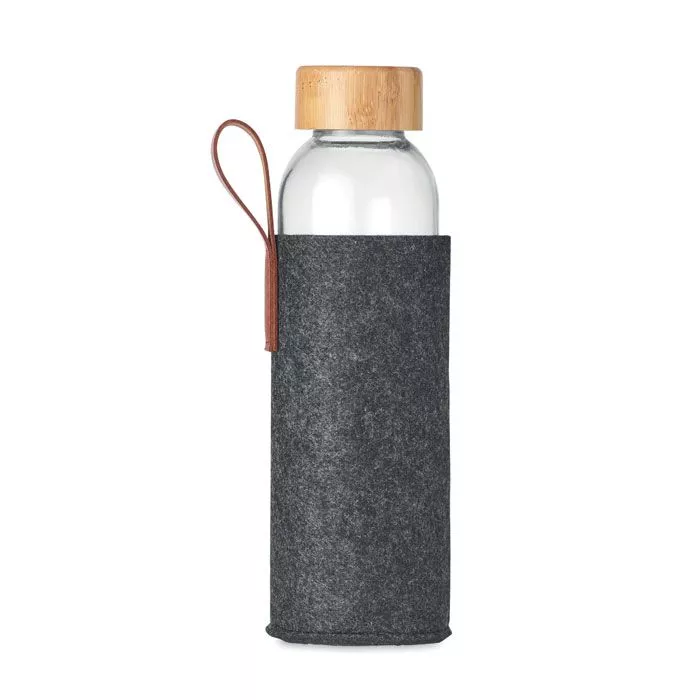 Стеклянная бутылка с бамбуковой крышкой с полиуретановой ручкой и чехлом из полиэстера RPET. Емкость: 500 мл.