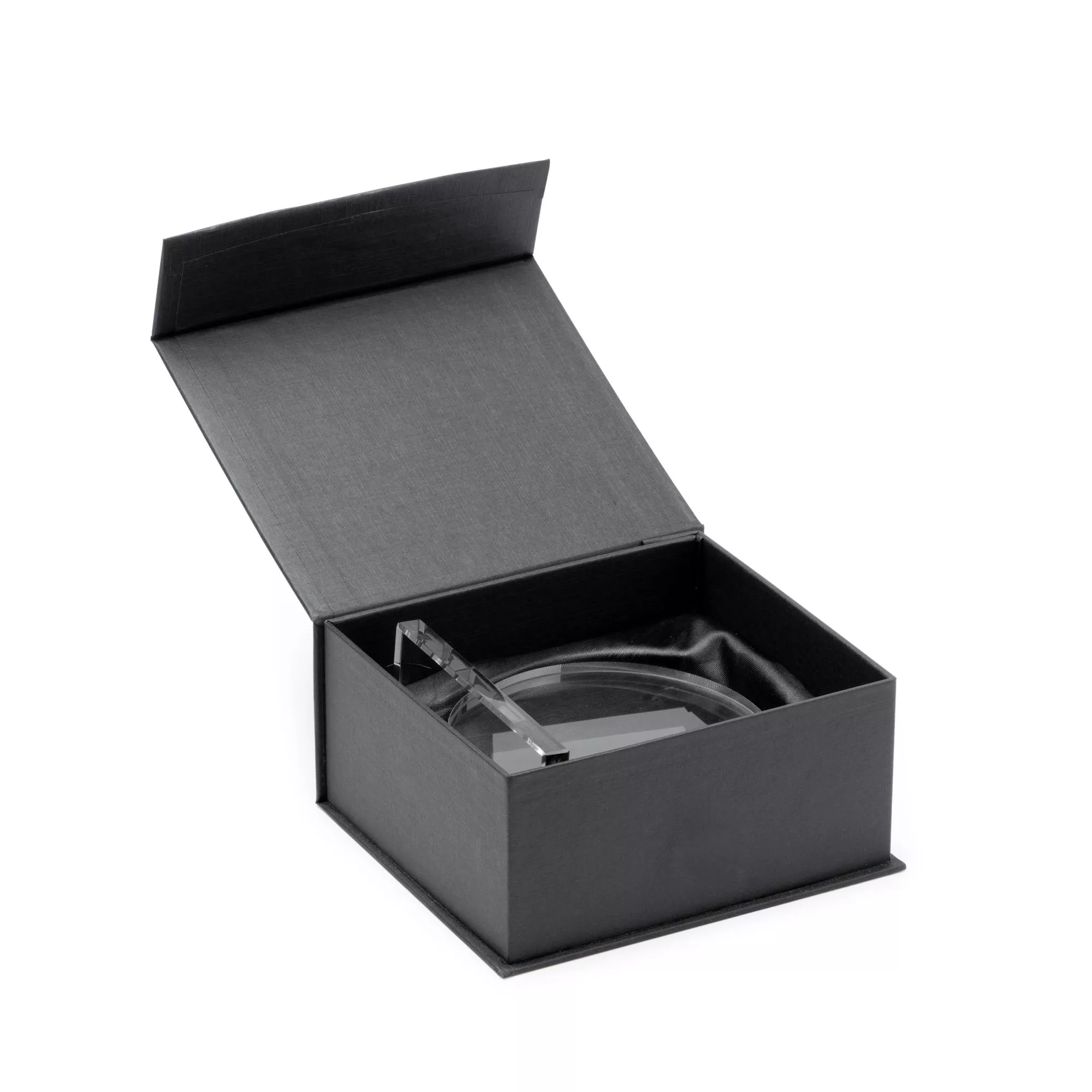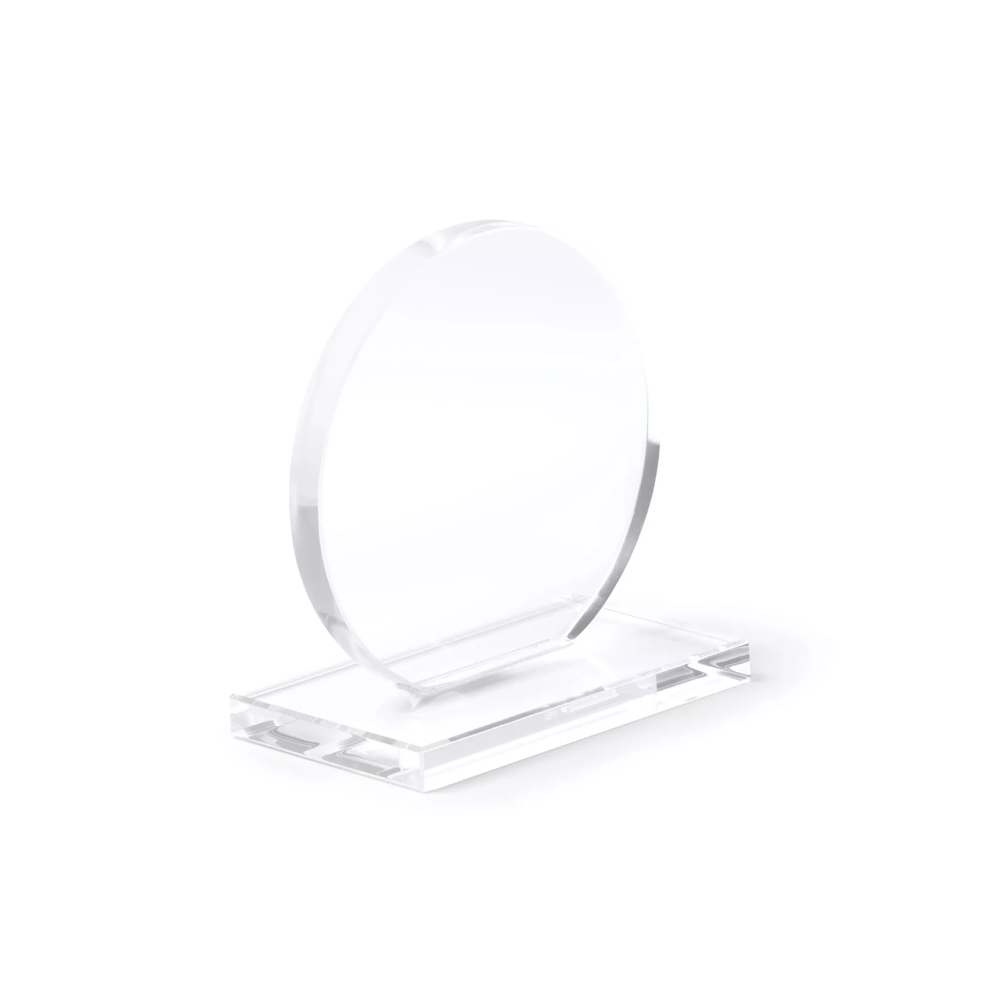 Стеклянная награда круглой формы с прямоугольным основанием. Включает черный презентационный футляр.