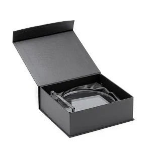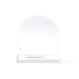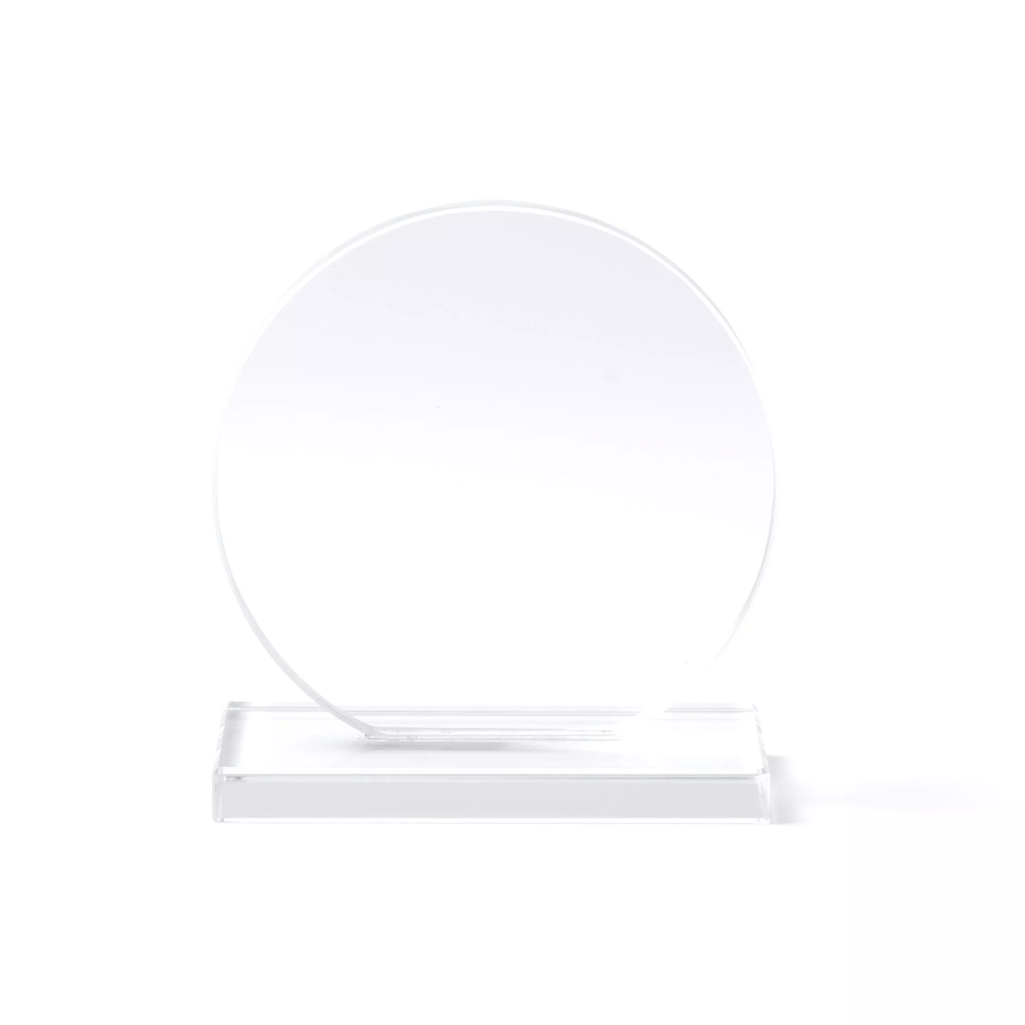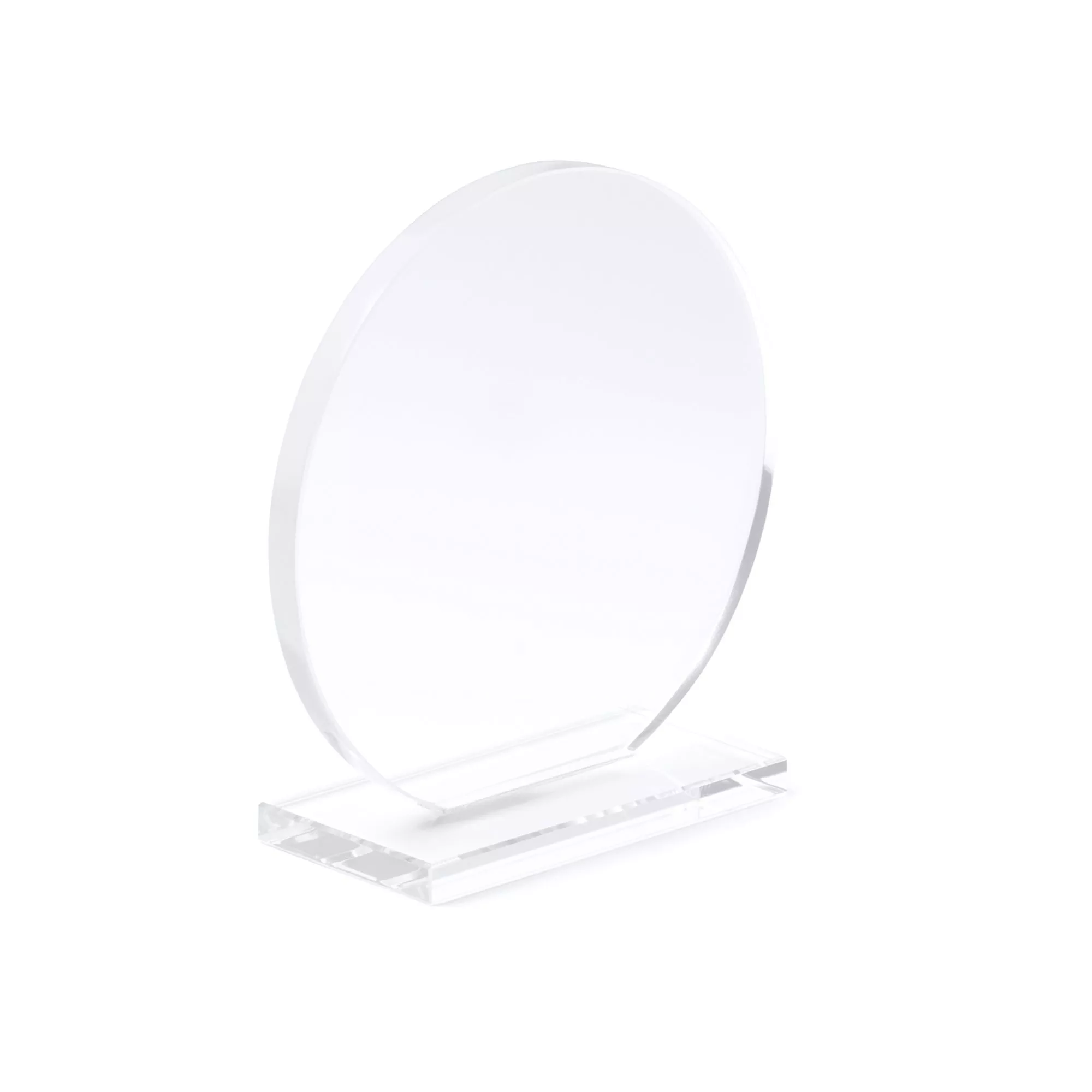 Стеклянная награда круглой формы с прямоугольным основанием. Включает черный презентационный футляр.