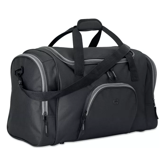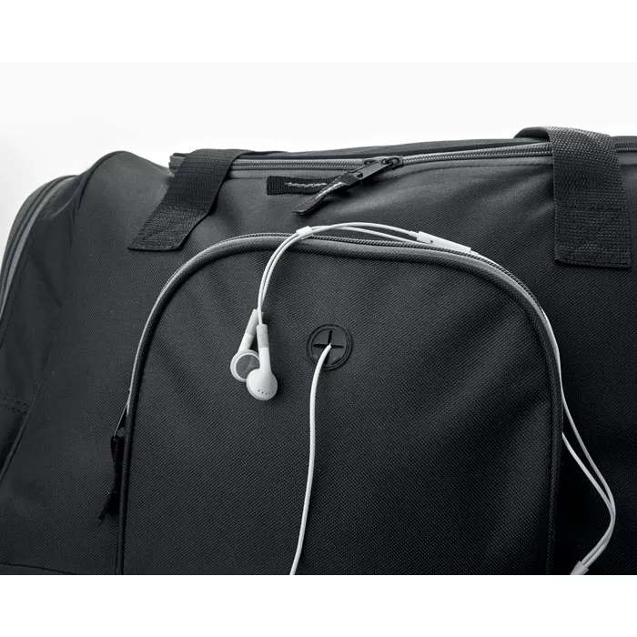 Сумка дорожная/спортивная из полиэстера 600D с 2 боковыми карманами, закрывающимися на молнию, и одним карманом для наушников. Съемный регулируемый наплечный ремень в комплекте.