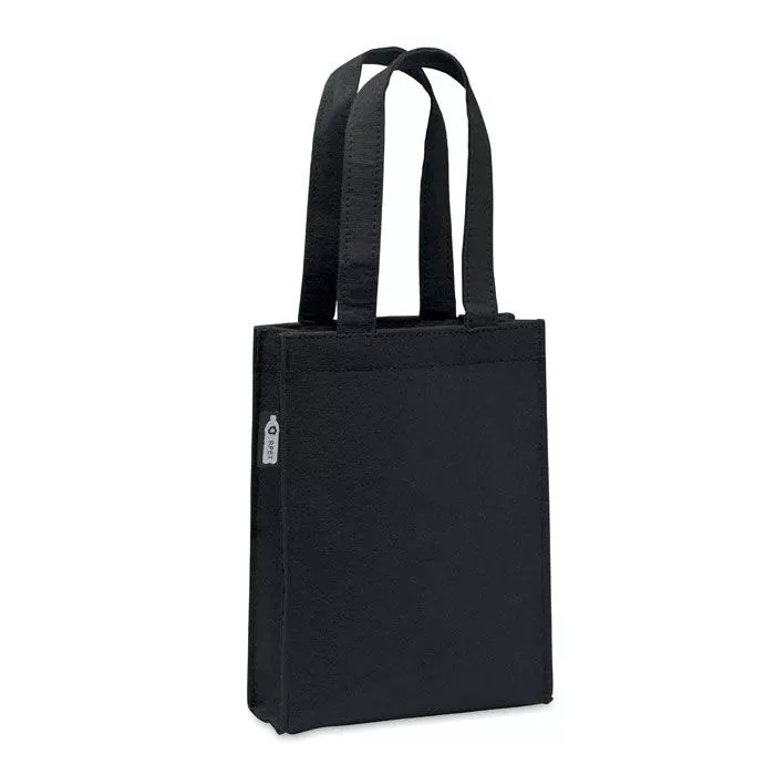 Небольшая подарочная или сувенирная сумка из переработанного войлока RPET с короткими ручками и ластовицей. Толщина войлока: 1 мм.