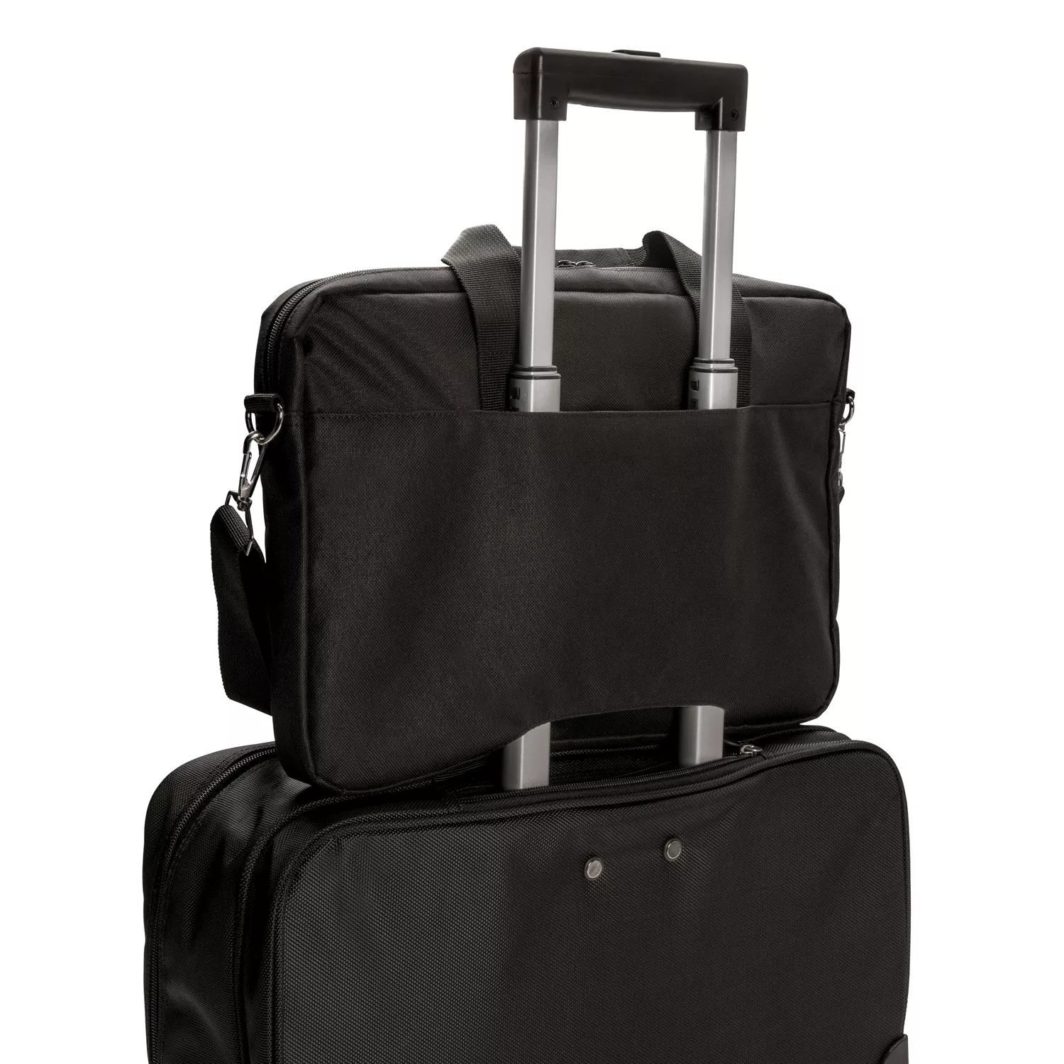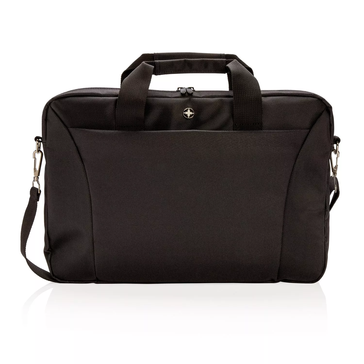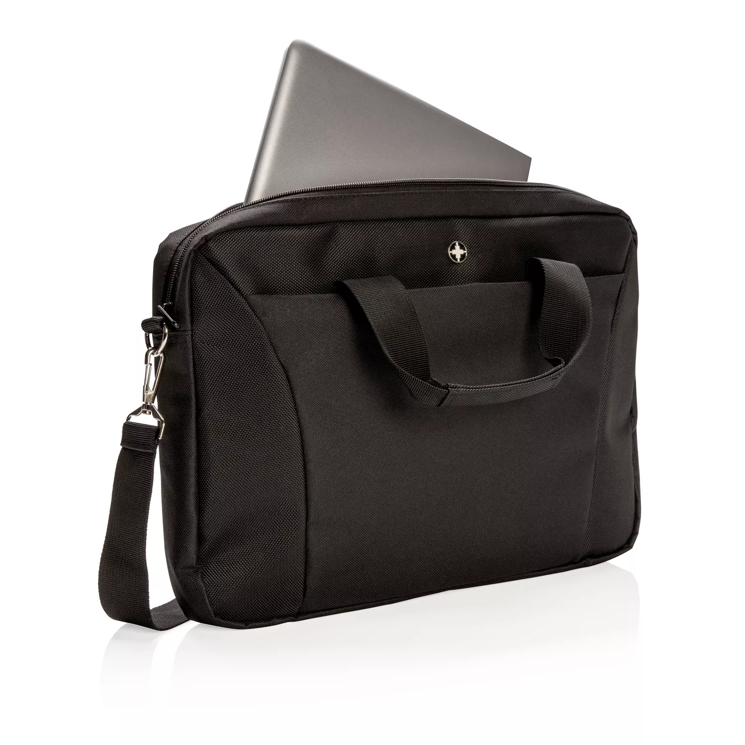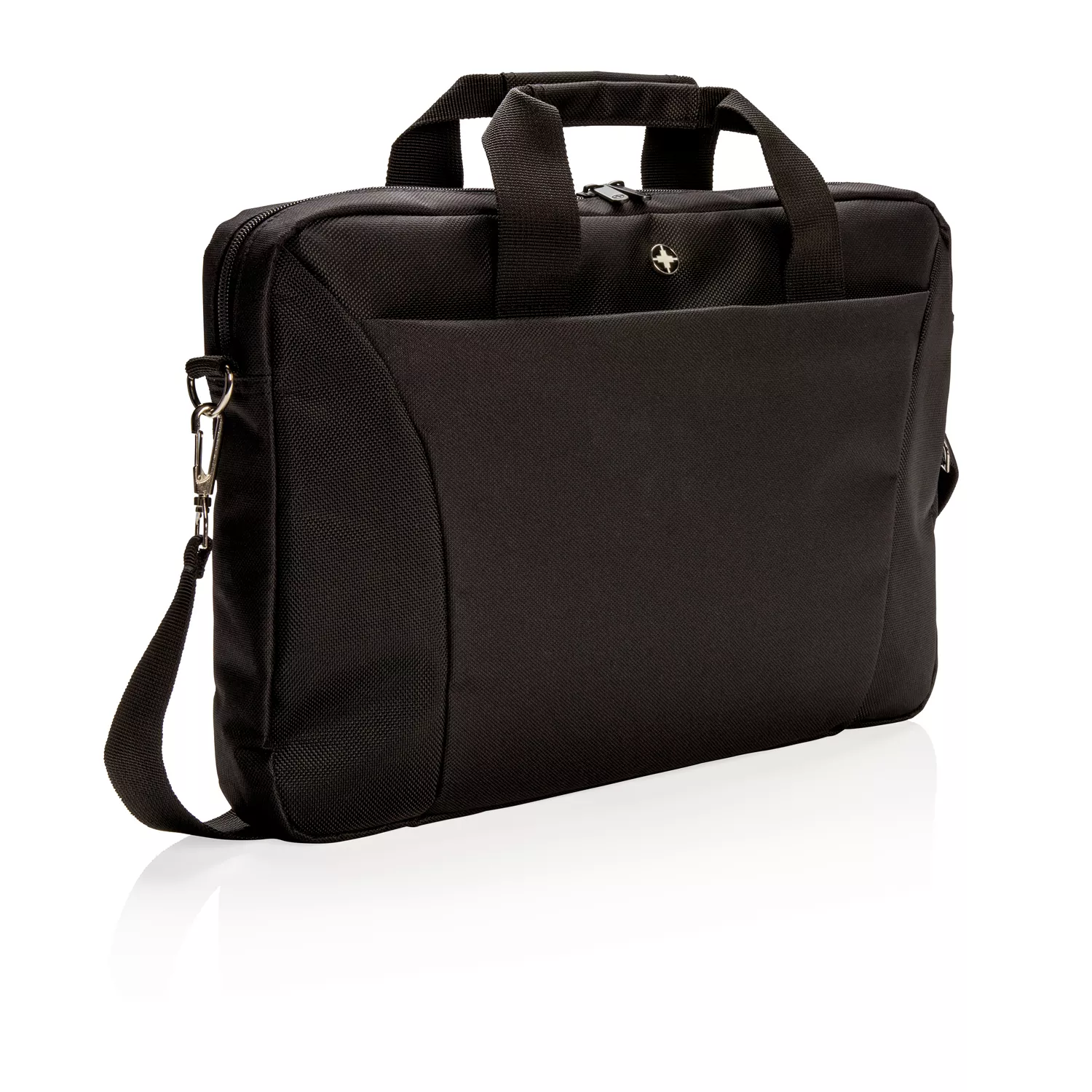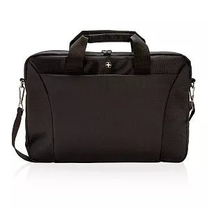 Удобная сумка для ноутбука Swiss Peak из прочного полиэстера 600D и 1680D. В сумке предусмотрен мягкий карман для ноутбука, отделение для планшета и передний карман на молнии с органайзером для хранения различных аксессуаров. Для вашего комфорта в путешествиях в конструкции сумки предусмотрены крепления на выдвижную ручку чемодана. В комплекте идет регулируемый плечевой ремень. Не содержит PVC.