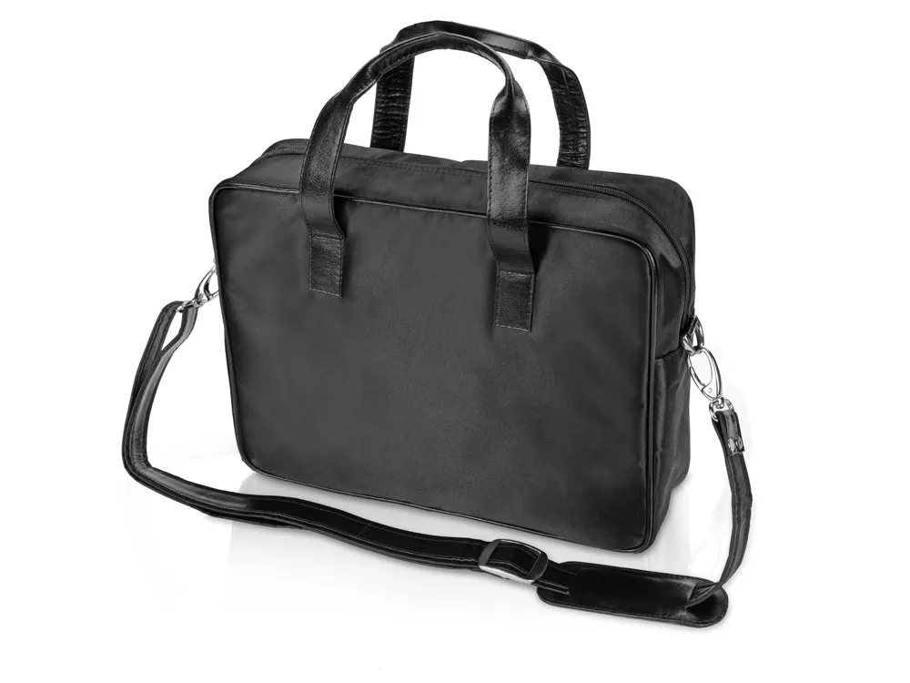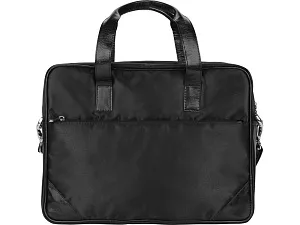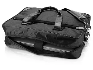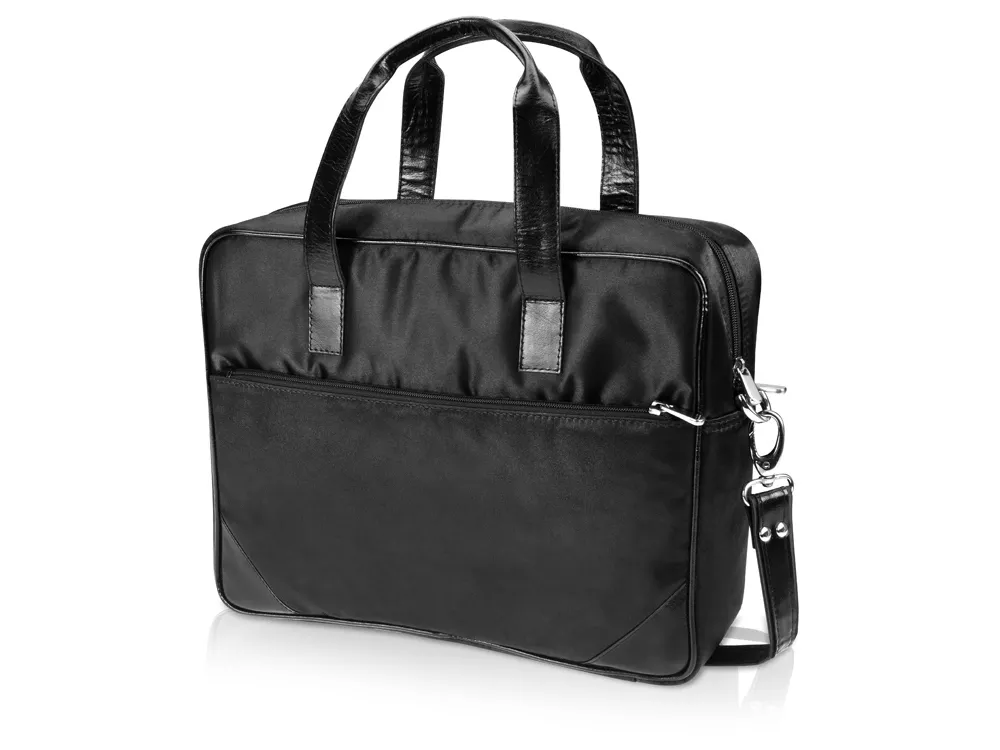 Сумка для ноутбука с ручками и вставками из натуральной кожи имеет одно отделение и внешний карман на молнии, в который удобно класть документы. К сумке можно пристегнуть длинный ремень и носить ее на плече.