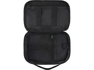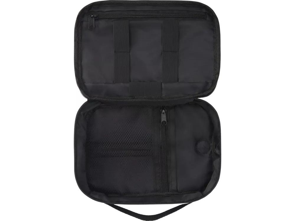 Сумка для техники Ross из переработанного ПЭТ, соответствующего стандарту GRS, идеально подходит для людей, постоянно находящихся в пути, и позволяет организовывать портативные зарядные устройства, зарядные кабели или любые другие электронные аксессуары. Имеет несколько карманов, эластичных петель и вставок для протягивания кабелей, позволяющих заряжать телефон, храня портативное зарядное устройство в сумке. Также имеет пластиковый карабин для крепления к другой сумке. Емкость: 1 литр.