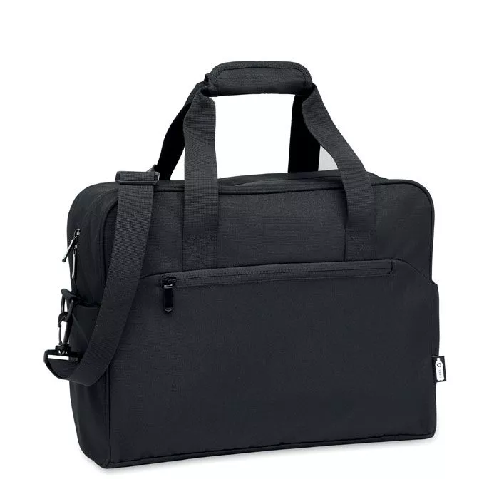Дорожная сумка из материала 600D RPET с большим передним карманом на молнии и двумя маленькими боковыми карманами. Включает отделение для 15-дюймового ноутбука. Съемный регулируемый плечевой ремень с мягкой подкладкой. Держатель для чемодана на обратной стороне.