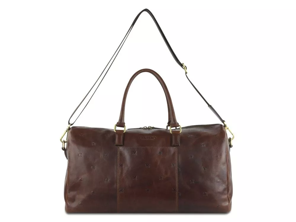 Коллекция DON LEON - квинтэссенция инноваций бренда MANO 1919®. Все изделия коллекции изготовлены вручную из высококачественной натуральной кожи буйвола в роскошном коричневом цвете. Элегантное тиснение в виде льва и изящный логотип подчеркивают индивидуальный стиль коллекции. MANO 1919 ®. Дорожная сумка M191921041 Эстетика и практичность: дорожная сумка M191921041 отличается элегантным стилем и удобной организацией внутреннего пространства. Вместительное отделение и дополнительные карманы обеспечивают идеальное хранение вещей, необходимых для поездки. Дорожная сумка станет незаменимым компаньоном для мужчин, которые ценят удобство и комфорт. Благодаря первоклассной коже, качественной подкладке и надежным застежкам дорожная сумка станет верным спутником в путешествии. Размеры: 27 см (В) x 50 см (Ш) x 24 см (Г) Материал: натуральная кожа буйвола Особенности: • Основное отделение на молнии с внутренним карманом на молнии • 2 больших кармана • Дополнительное отделение • Съемный регулируемый плечевой ремень до 145 см