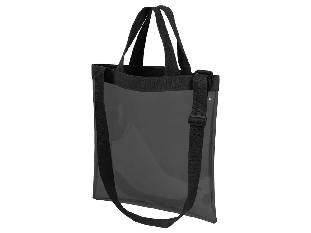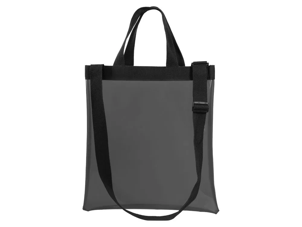 Легкая и вместительная сумка из прозрачного пластика с длинной лямкой из парусины, регулирующейcя по длине, незаменима для шоппинга или путешетсвий. Для большего удобства у сумки есть 2 короткие ручки. Трафаретная печать (1 цвет (цветные изделия)) на данный товар осуществляется бесплатно. Оплачивается только настройка оборудования в размере 8700 рублей на весь тираж.